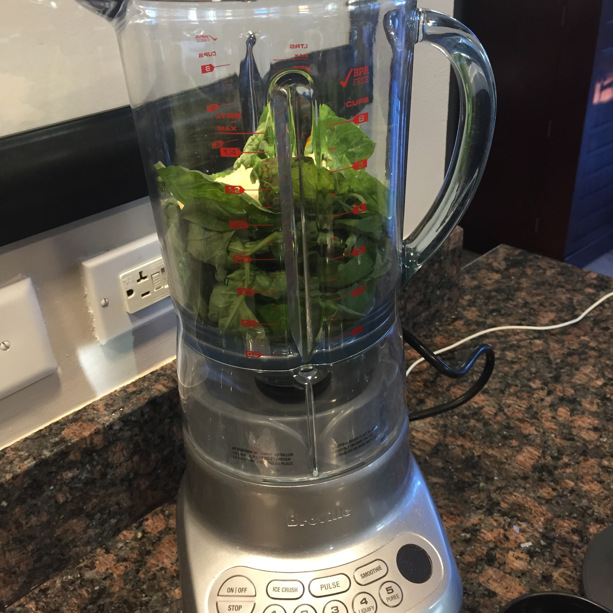 IMG_8125First you’ll want to prep the pesto so you have it on hand for assembly. In a blender (Breville BBL605XL Hemisphere Control Blender) or food processor, add the basil, pine nuts, parmesan cheese, and garlic. While the blender is running, steadily drizzle in the olive oil and mix until emulsified. Add a pinch of salt and pepper to taste. Set aside.