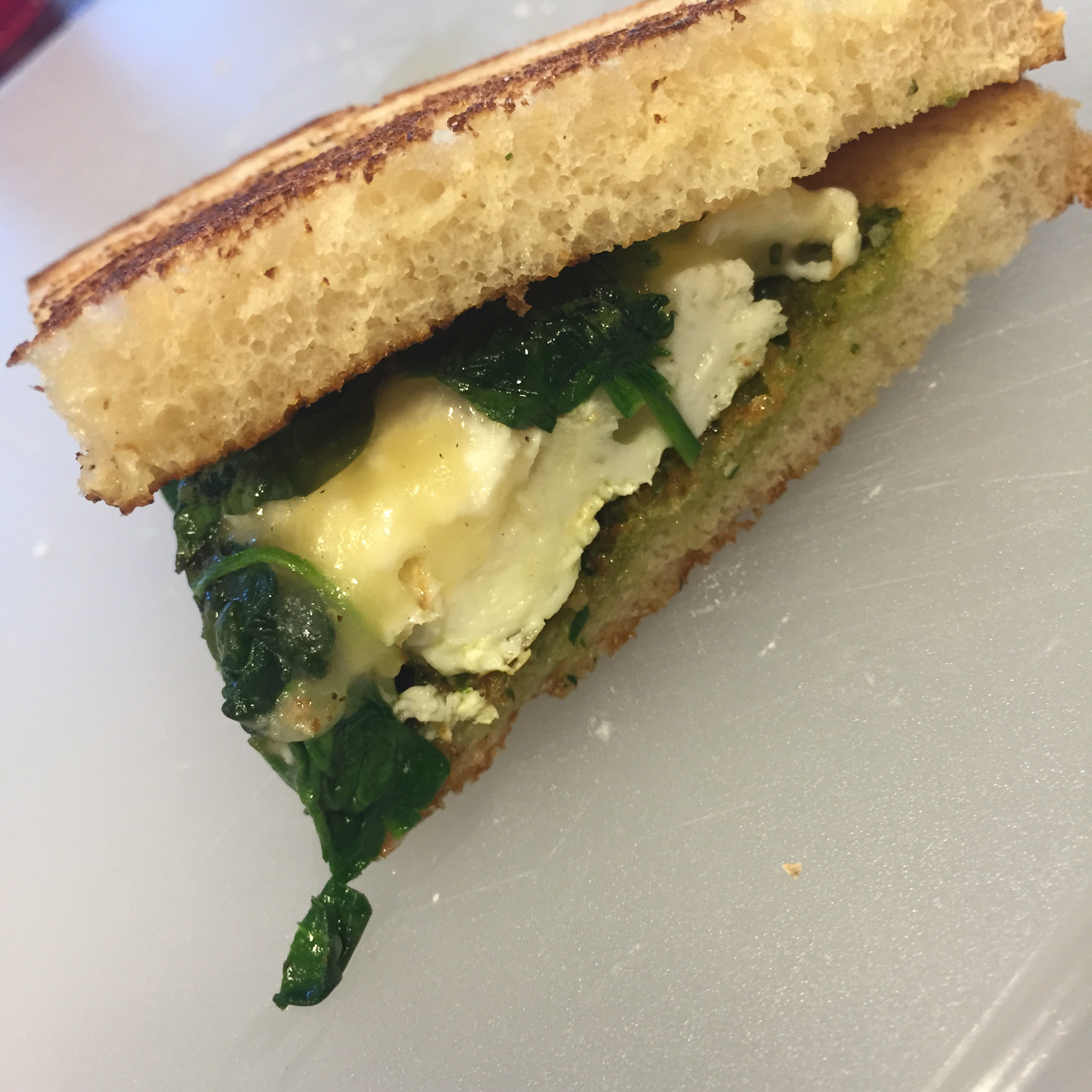 If you have a panini press, you wouldn’t have to worry about melting the cheese earlier like I instructed. Instead, what you’ll do is assemble the toasted bread spread with pesto, then layer the egg, spinach, and cheese. Then press in a panini until cheese is melted. We don’t travel with our panini press since it won’t fit in my carry on luggage, so this is how I make these sandwiches while we are on the road.