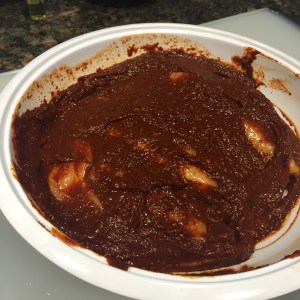 Soak the dried ancho chile peppers in warm water until soften. You can do this the night before if you’d like, or it can take a few hours to soften. The next morning you can assemble your marinade. Remove the chiles from the water and in a blender, blend ancho chiles and chipotle peppers with adobo sauce into a smooth purée.