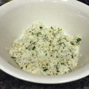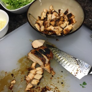 Remove from pan and get ready to assemble burrito bowls. Let chicken rest for about 5 minutes. Cube chicken into about 1 inch dice. Set out all your Chipotle fixings in individual bowls and allow everyone to make their own burrito bowls how they like it.