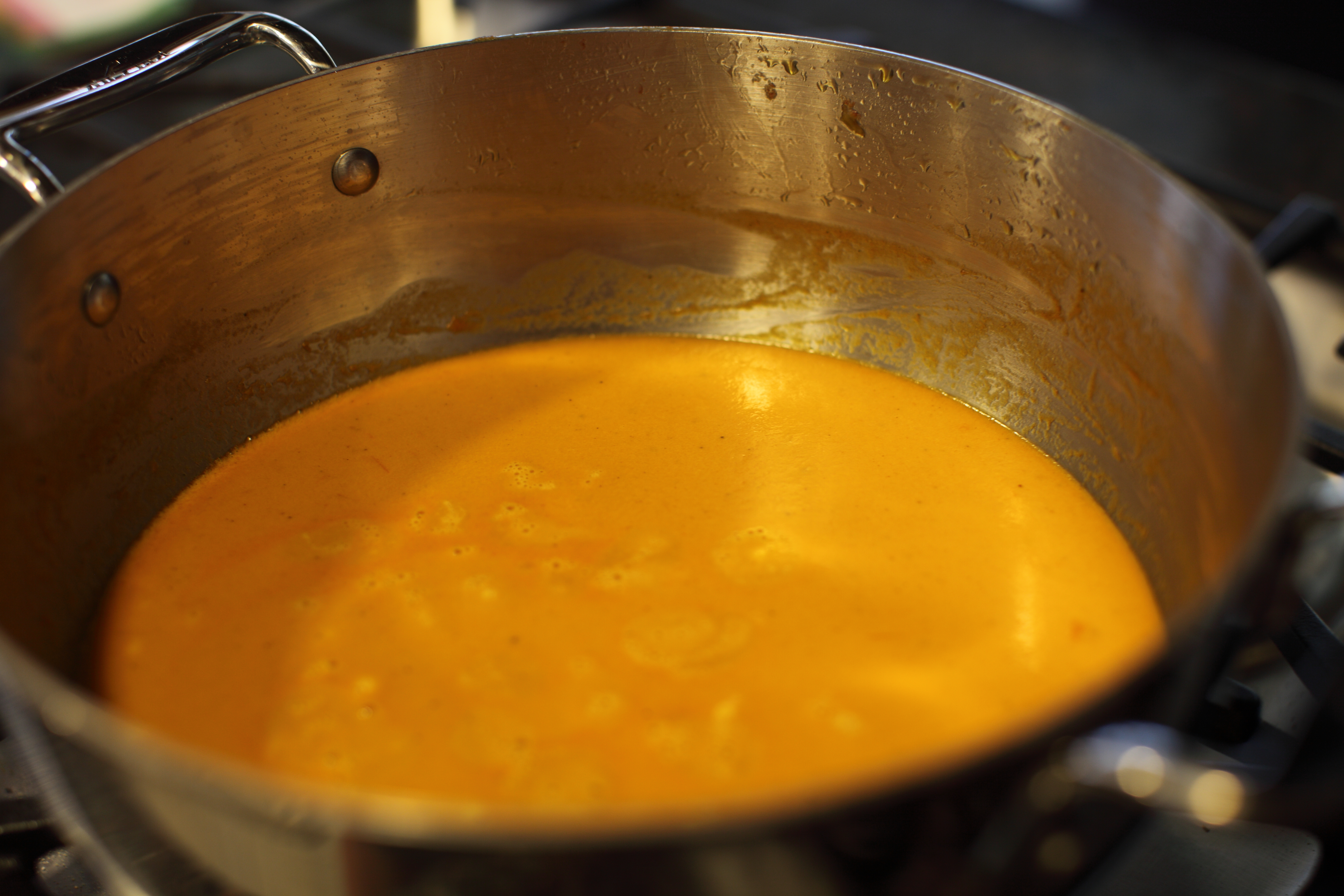 Once the tomato mixture is finished roasting, add everything in a large stock pot along with 3 cups of chicken stock, bay leaves, and butter. Heat on medium high heat until boiling, and then reduce to a simmer for about 15-20 minutes.
