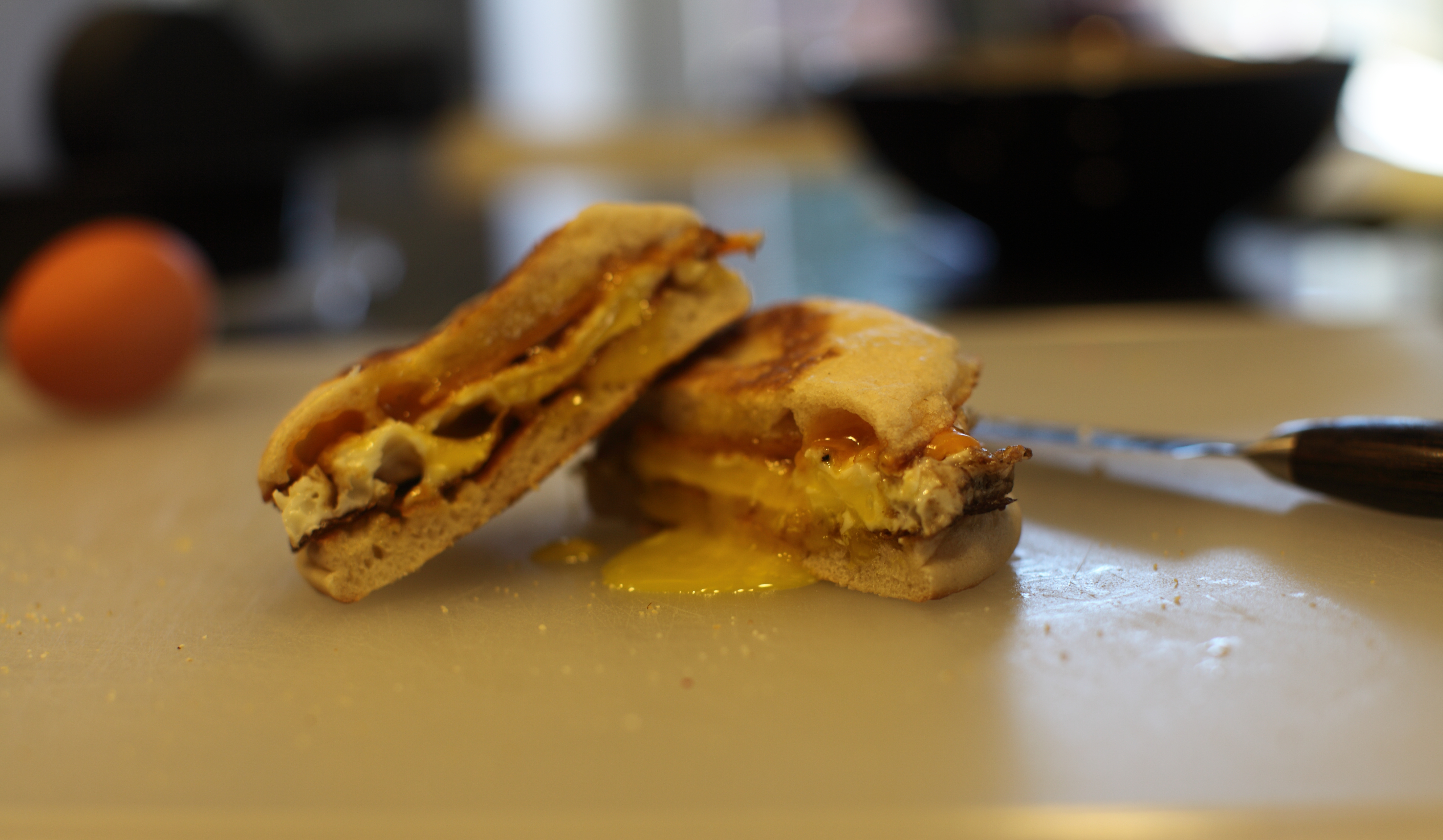 Once you have the egg to desired doneness, remove from pan and assemble into a sammy with the toasted english muffin. The sammy pictured below is cooked with that creamy runny yolk oozing out of it.