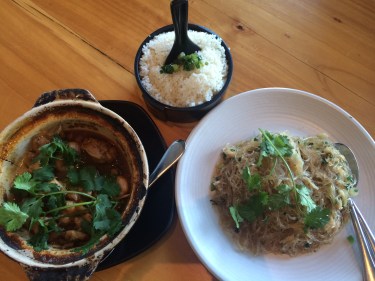 (Left to Right: Organic Chicken Claypot with a side of jasmine rice & Cellophane Noodles with Dungeoness Crab)