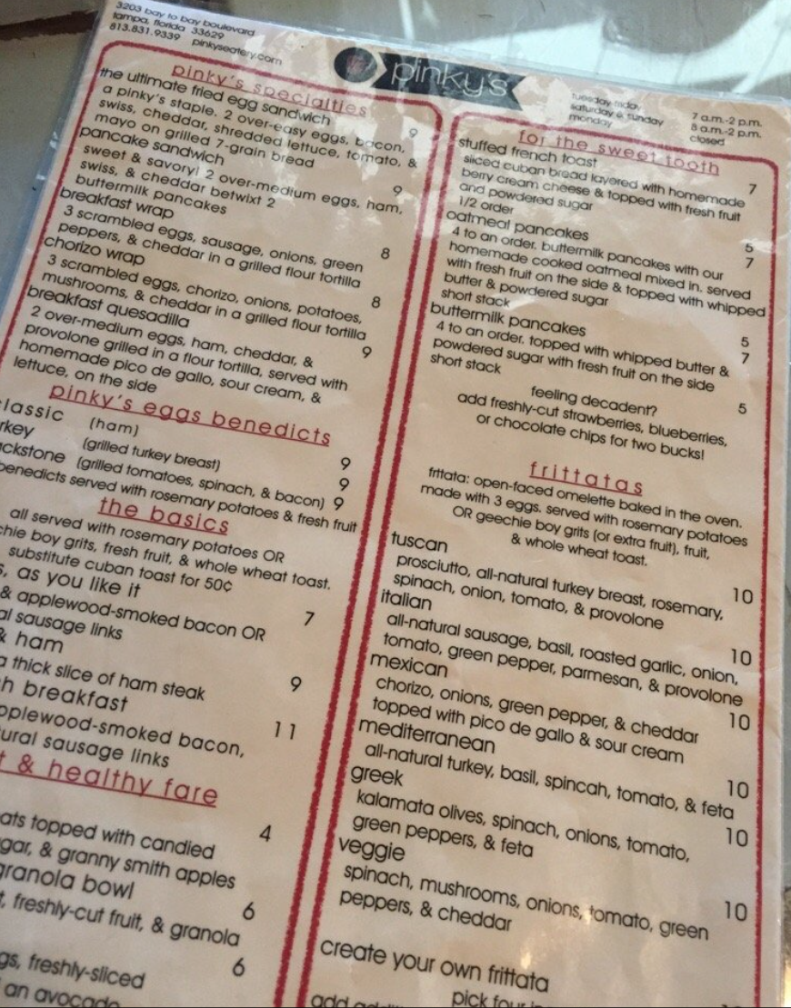 Instagram. They have been voted Creative Loafings Best of the Bay for best breakfast 5 years running, the people have spoken! They also just opened Pinky’s Annex next door selling eclectic gifts and candles that reflect the eatery’s decor. The restaurant is closed Monday’s (which explains the service with a smile available on Monday’s only pictured to the left) and are closed after lunch at 2 the rest of the week so plan your trip there accordingly. With the specials written with chalk on the wall, you have to check this place out if you’re in the Tampa Bay area.