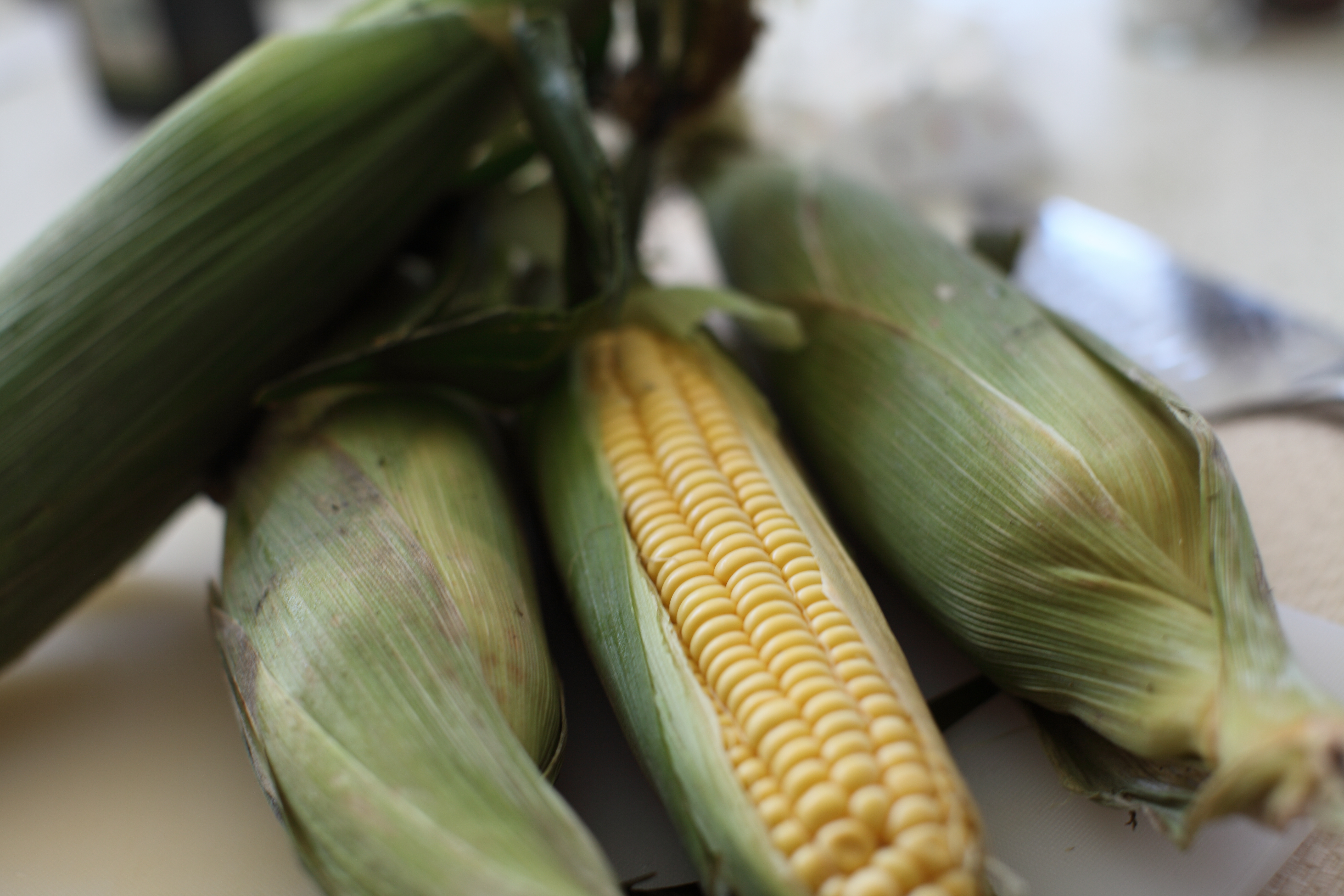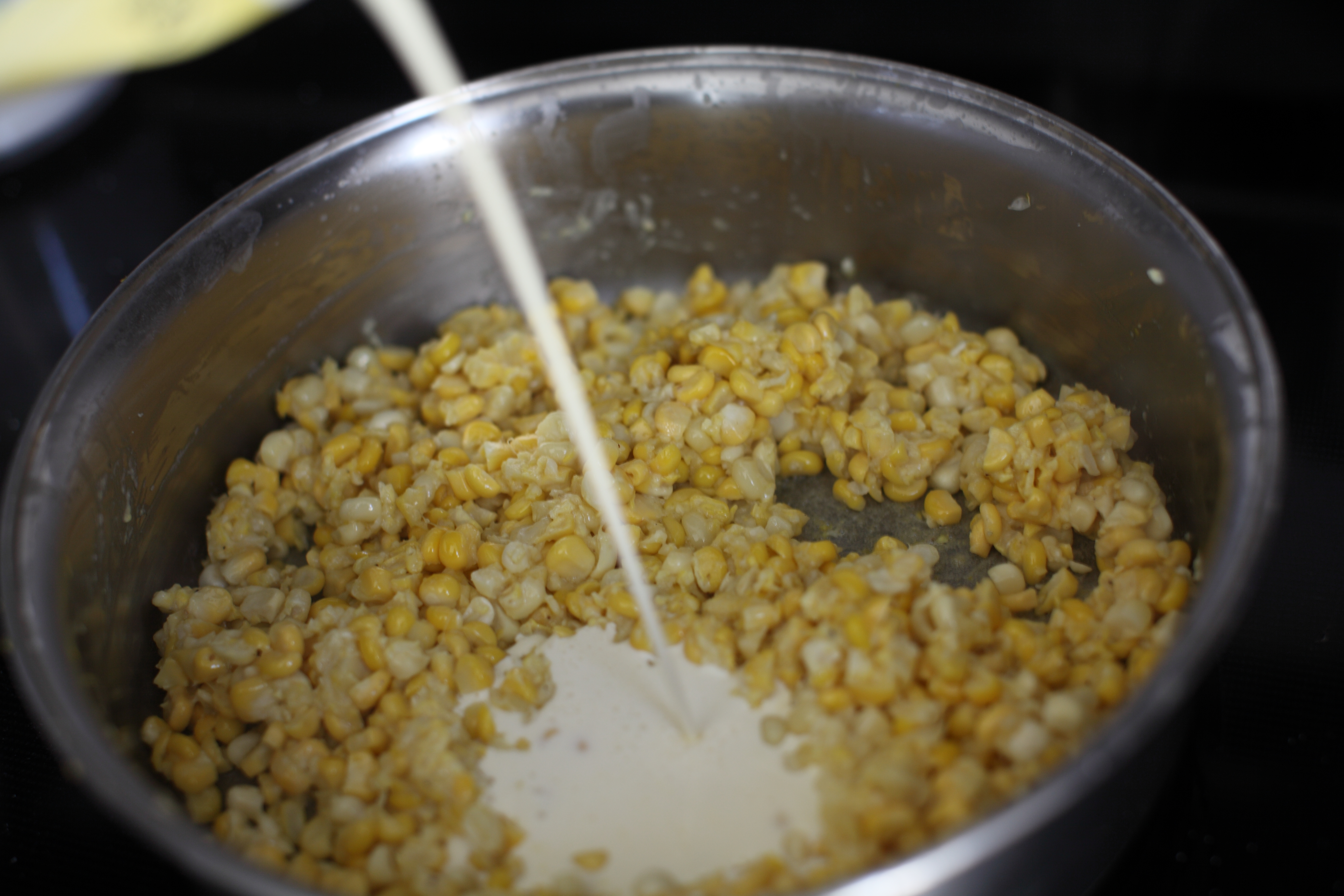 Shuck the corn out of its husks and clean corn of any silk hairs. Holding the corn vertically in a skillet that you will use to cook the corn, run a knife down the ear making sure you don’t cut into the cob just cutting off the kernels. Don’t discard the cob just yet, you are going to run the back of your knife along the cob releasing any remaining pulp and milk from the cob. On medium heat add butter, onions, and garlic to skillet with corn and season with salt and pepper. When the butter is melted and the onions are softened, about 4 minutes, sprinkle flour on top of corn. Stir in the flour and cook it off for 2-3 minutes. Slowly add the heavy cream and add a pinch of sugar and whisk. Reduce heat to low and simmer until cream thickens. If your sauce is too thick you can thin it out by adding milk, just be sure to adjust your seasonings when you add more liquid so you’re not muting those flavors. Remove from heat and season with additional salt and pepper to taste.