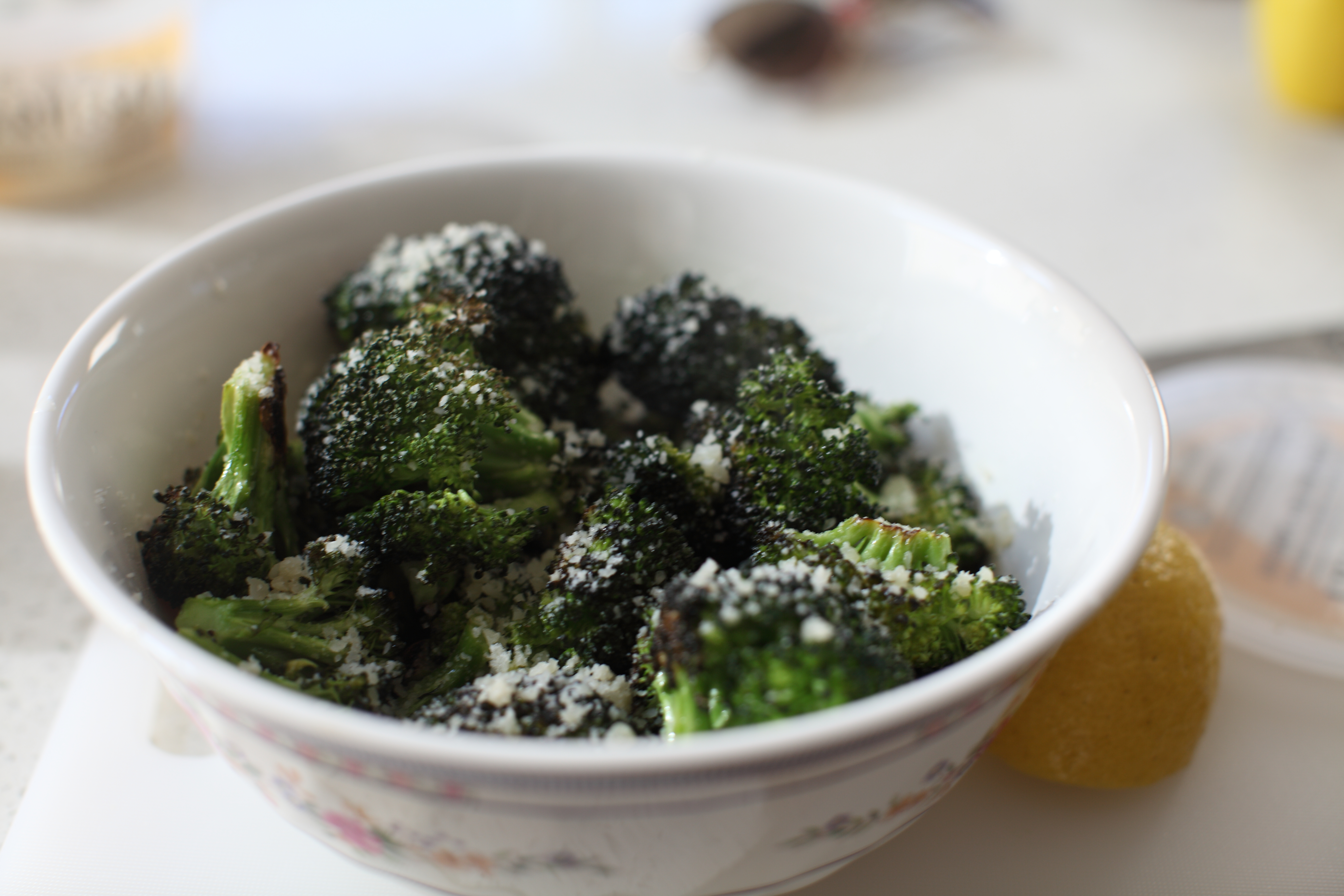 Preheat oven to 425 degrees F. On a rimmed baking sheet toss broccoli in olive oil and season with salt and pepper. Roast for 15-20 minutes until broccoli is still crispy and parts are the broccoli is browned. Remove from oven and squeeze 1/2 lemon over broccoli. Sprinkle grated parmesan over broccoli and serve warm.