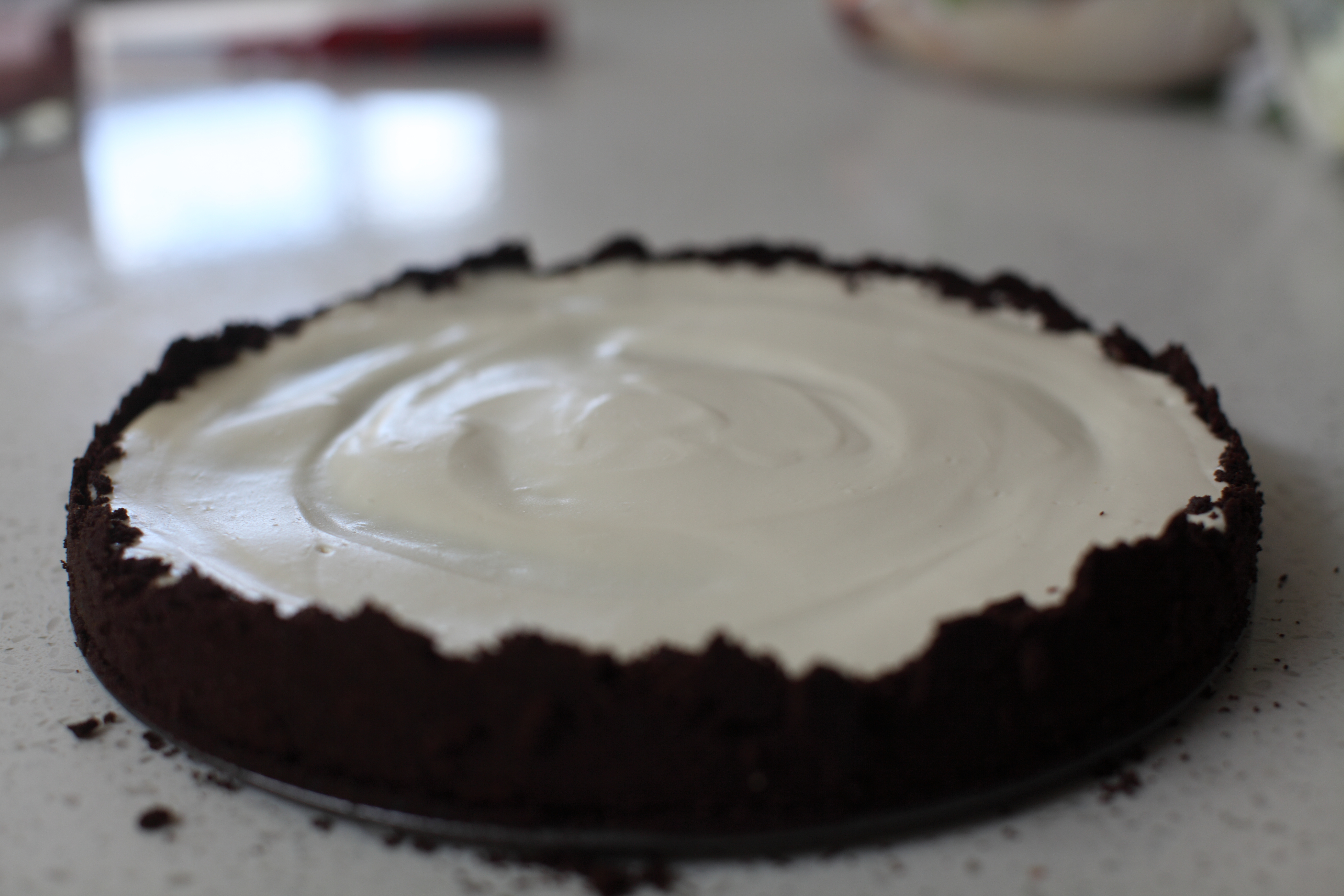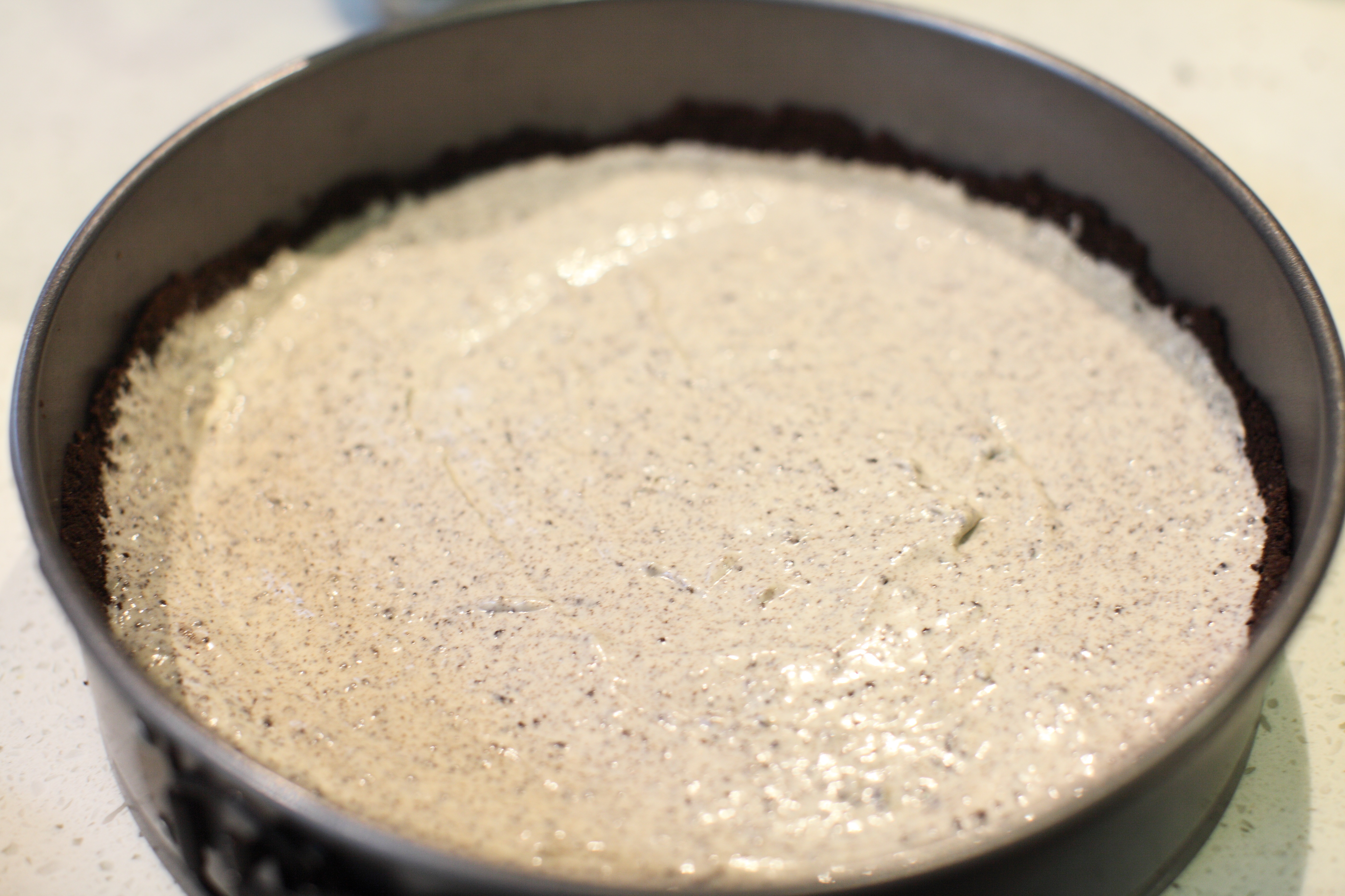 Using a hand mixture or Kitchenaid stand mixture whip heavy cream, vanilla, and sugar until peaks form. If you don’t have a mixer you can whip this by hand but you have to put some serious muscle into it to get air in the cream. Gently fold cookie crumbs into mixture and top your cheesecake!