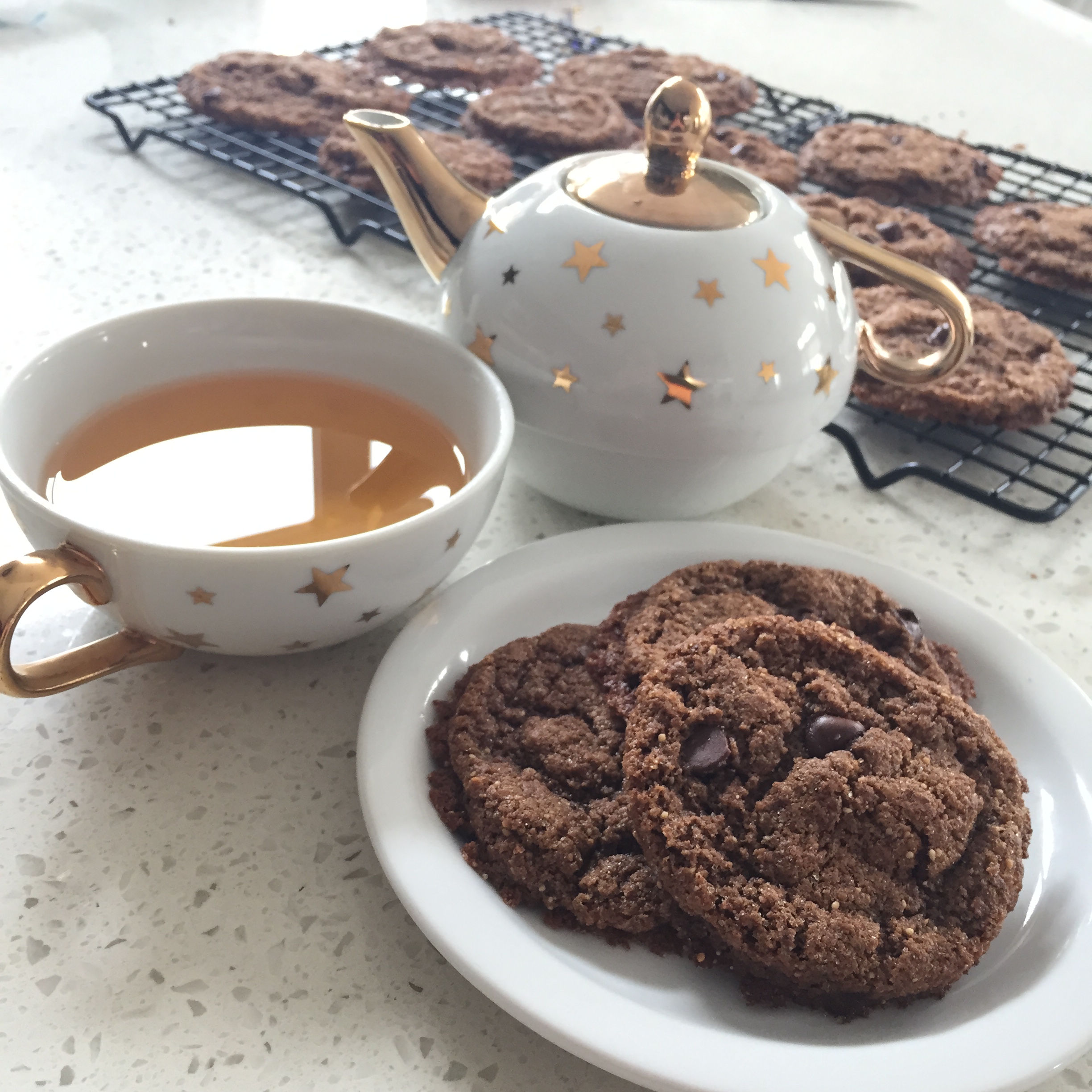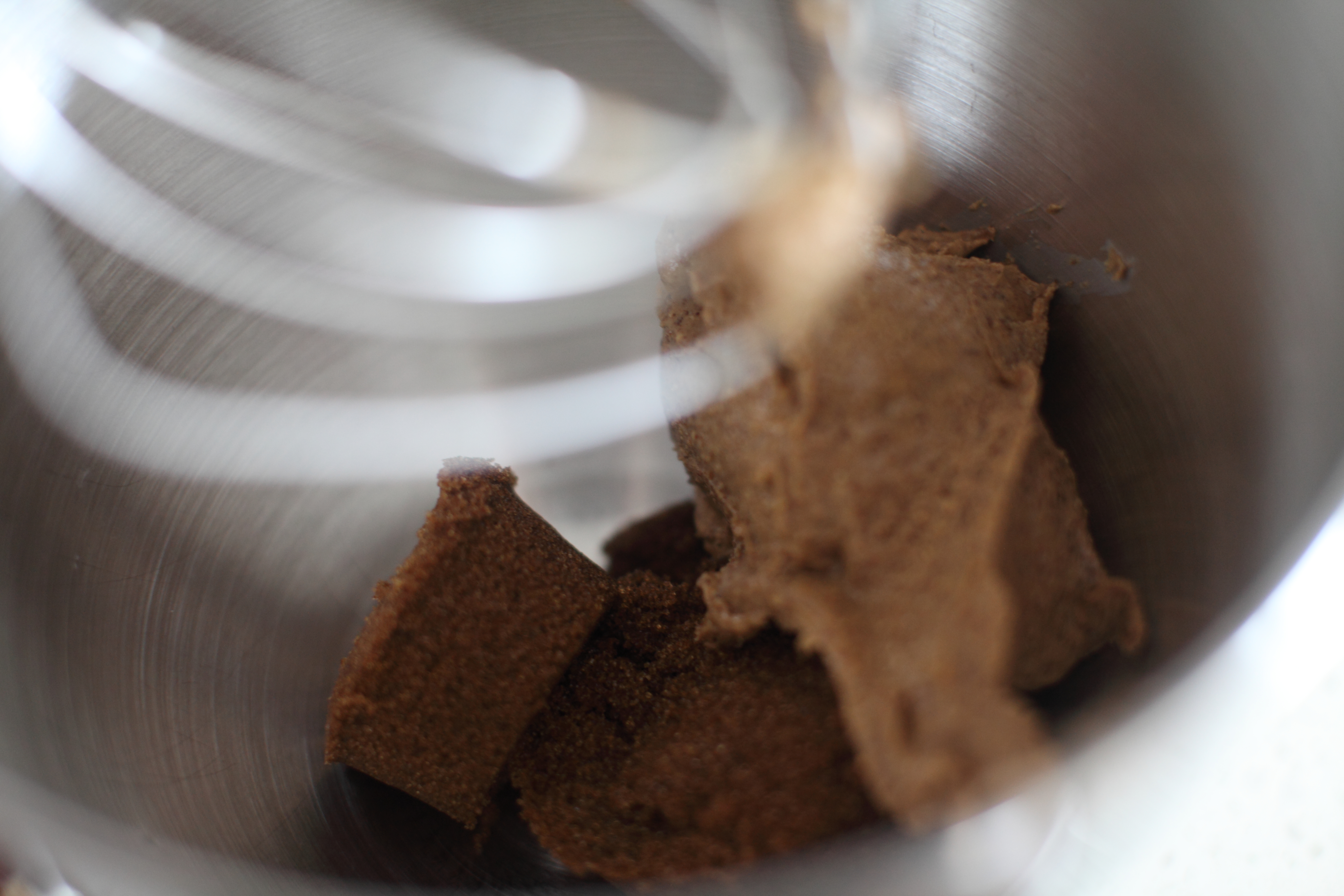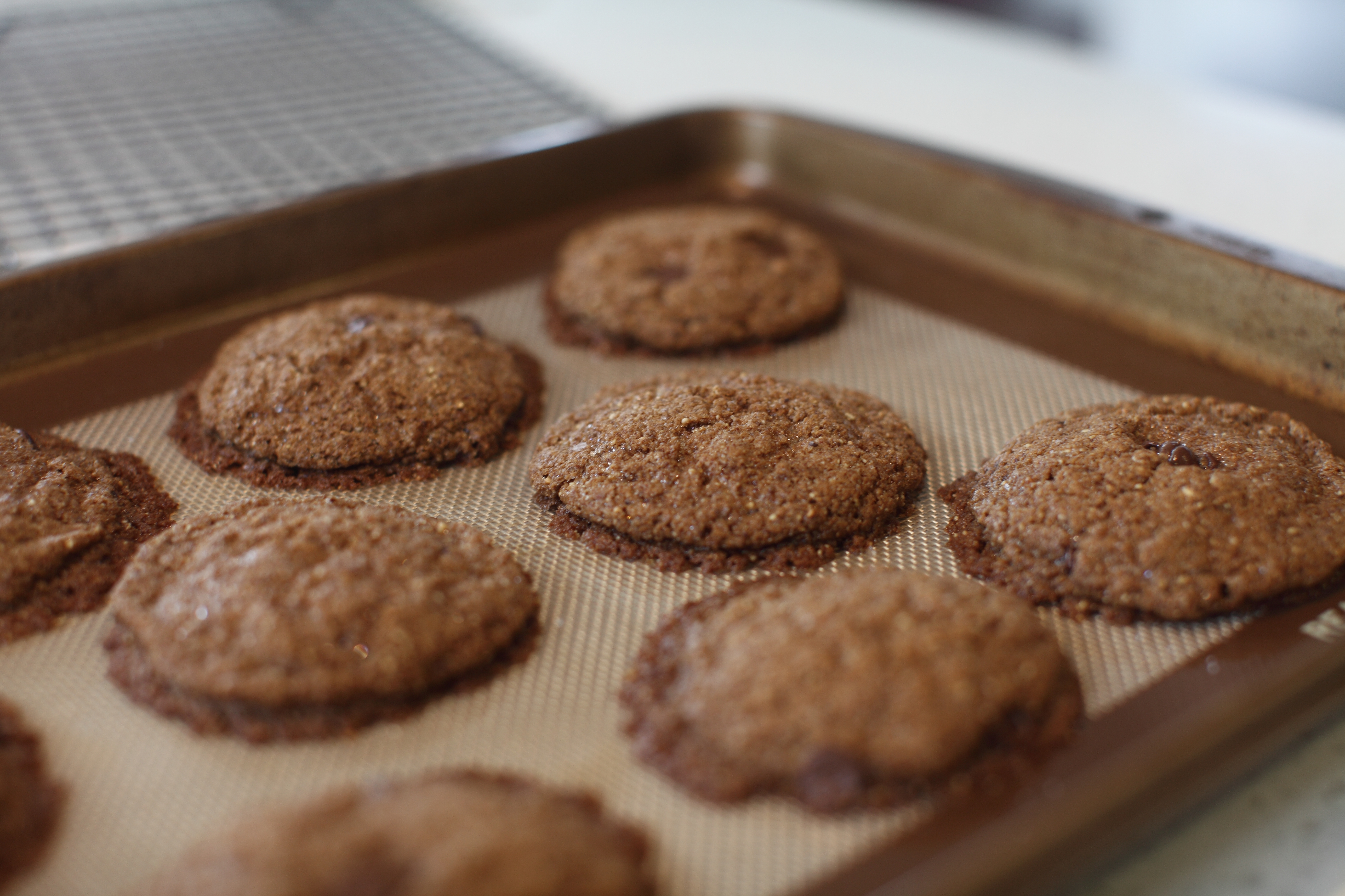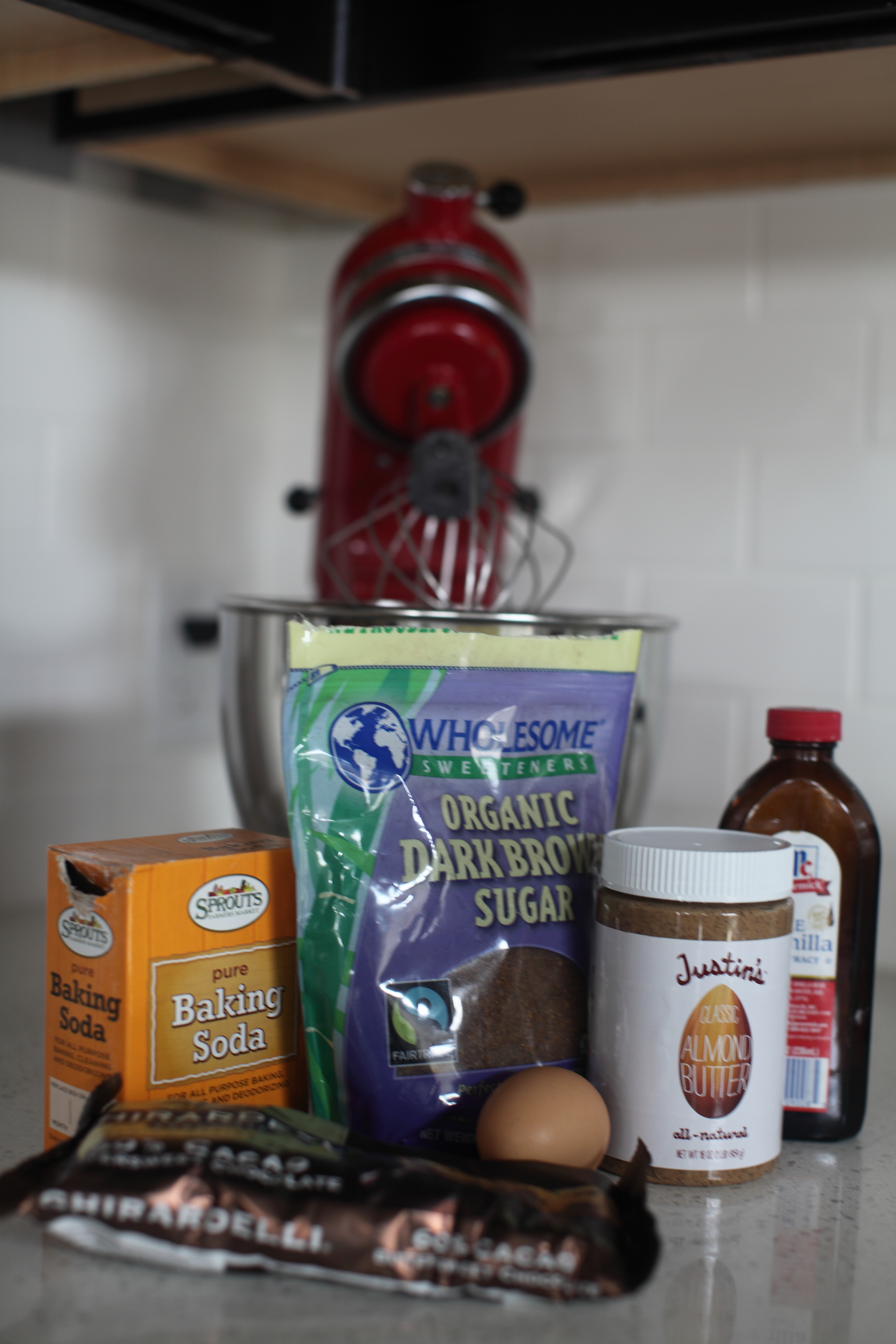 In a stand mixer, cream together almond butter and brown sugar until smooth. Mix in vanilla extract and egg, scraping down the sides of the bowl so no one is left out of the mix. Stir in baking soda and salt. Fold in your choice of chocolate chips (lactose intolerant peeps: use dark chocolate chips).