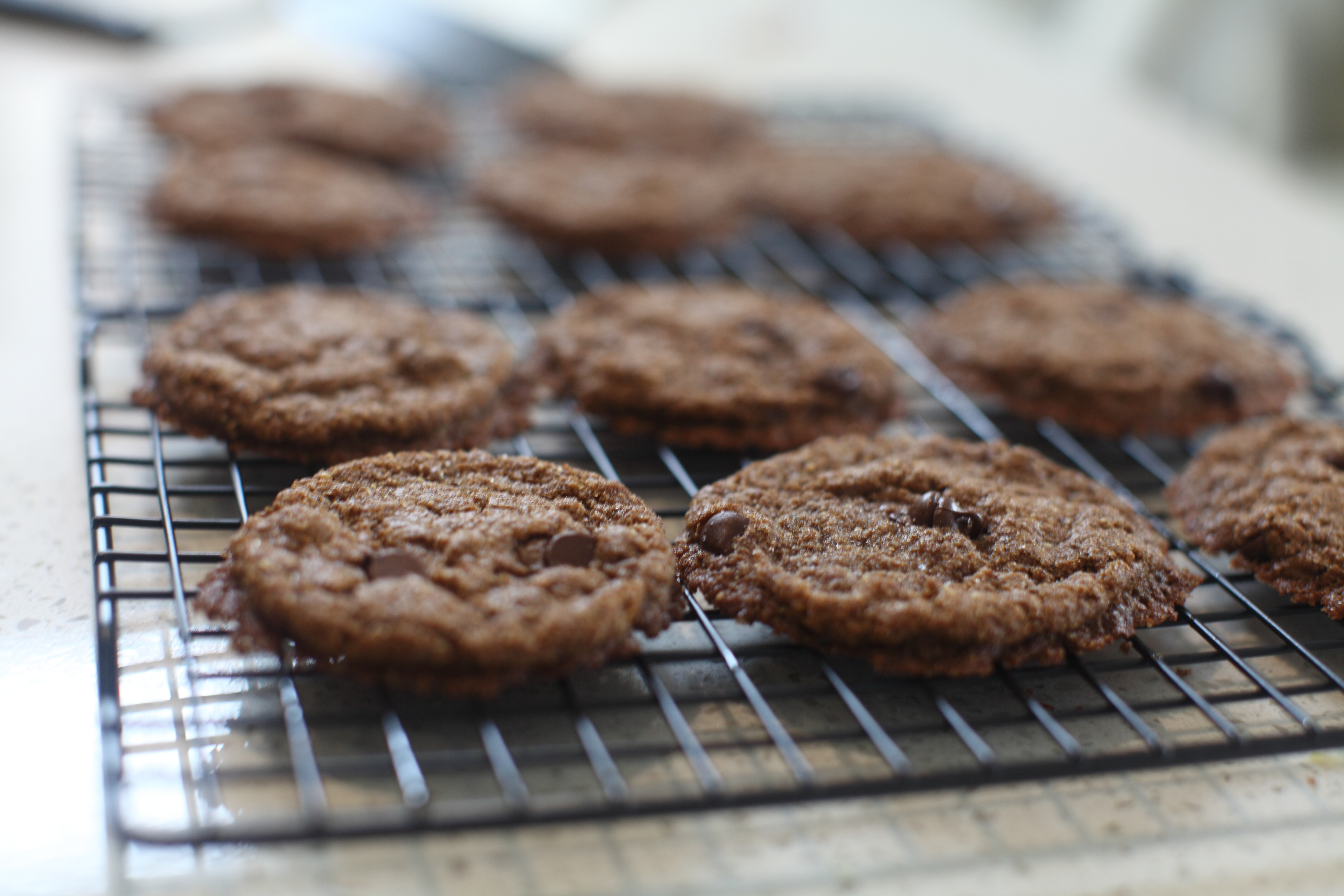 Place in oven to bake 8-10 minutes depending on your oven, but be careful not to over bake!! When you see a nice golden crust form on the edge of the cookies they are done. Remove from oven and let them cool on the baking sheet for 3 minutes. Immediately transfer cookies to a cooling rack to cool completely. This makes about 16 cookies that will magically disappear when your will power has given up and you are tired of waiting for them to completely cool. If you’re fortunate enough to have leftovers, keep in an airtight container.
