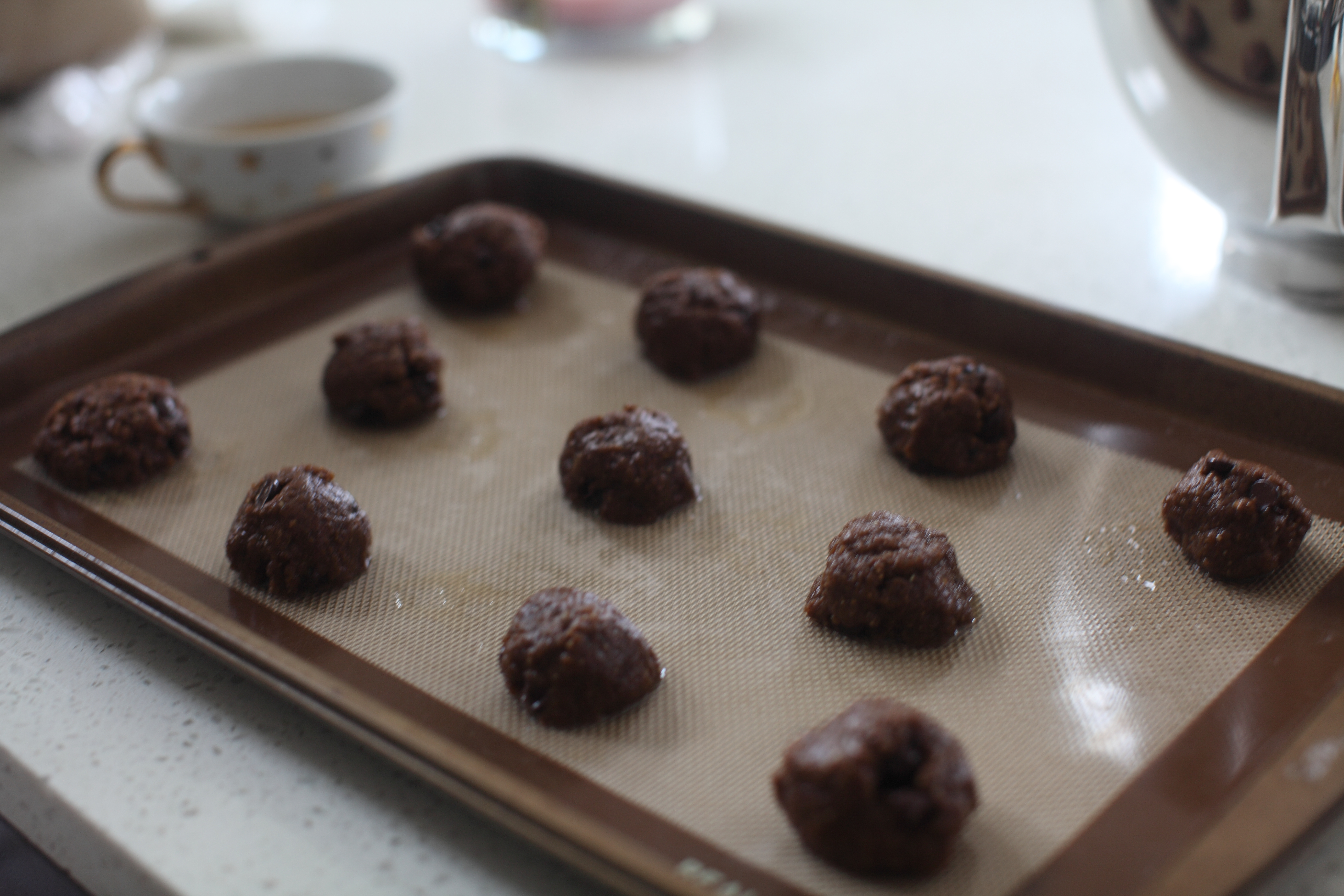 Line a baking sheet with parchment paper or a silpat (non-stick baking mat found here on Amazon: Artisan 2 pk. Non-Stick Silicone Baking Mat Set, 16 5/8 x 11). Form about 1 inch balls of dough, firmly packing them. Its ok that you are releasing oil when you are forming the balls, some cookies will have too much natural oil from the butter and you can see will form a crust around the cookies. This is ok! Some will look prettier than others and are just as tasty!! You are going to want to space them about an inch and a half apart. The dough will spread out when baking. Sprinkle tops with a little more kosher salt.