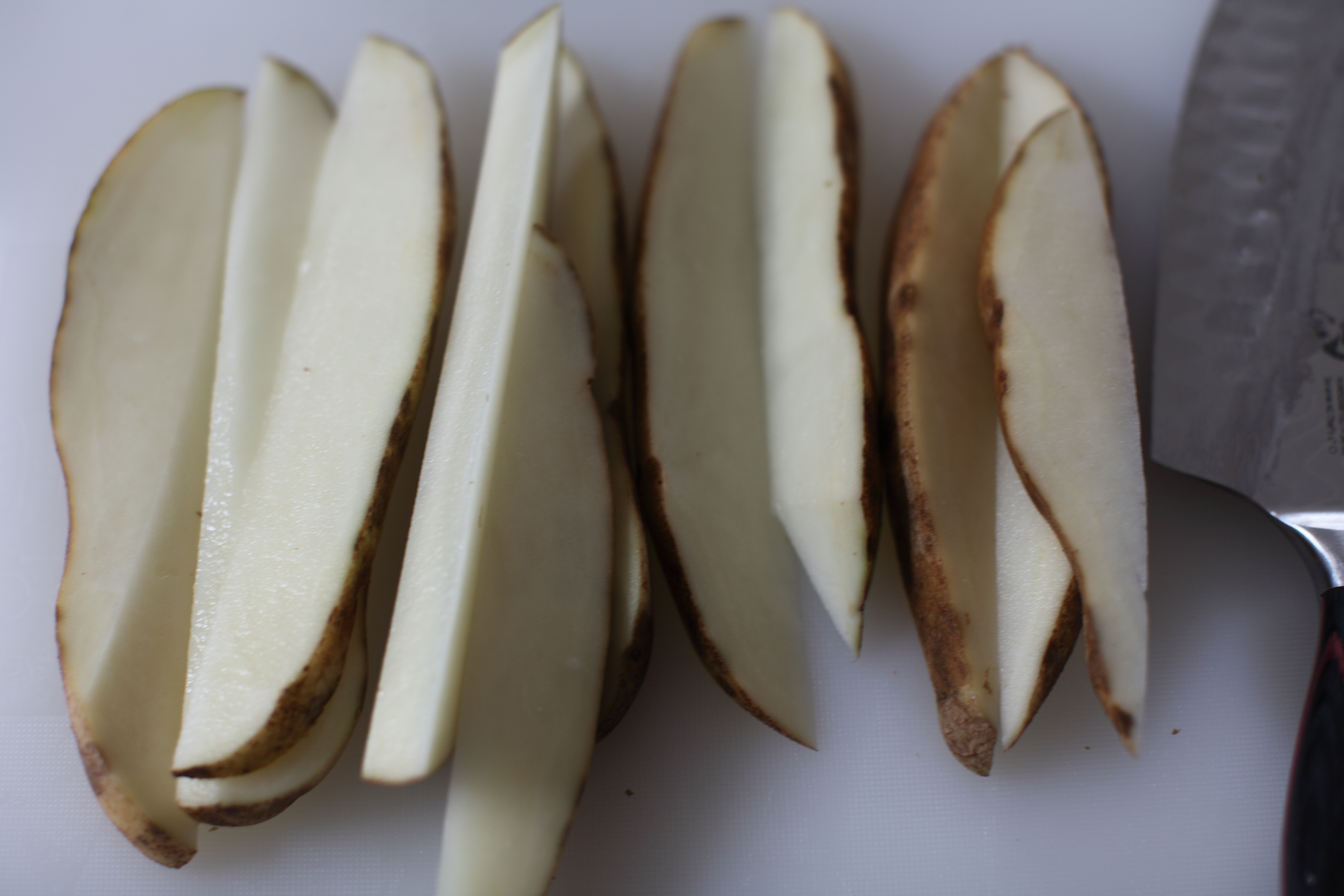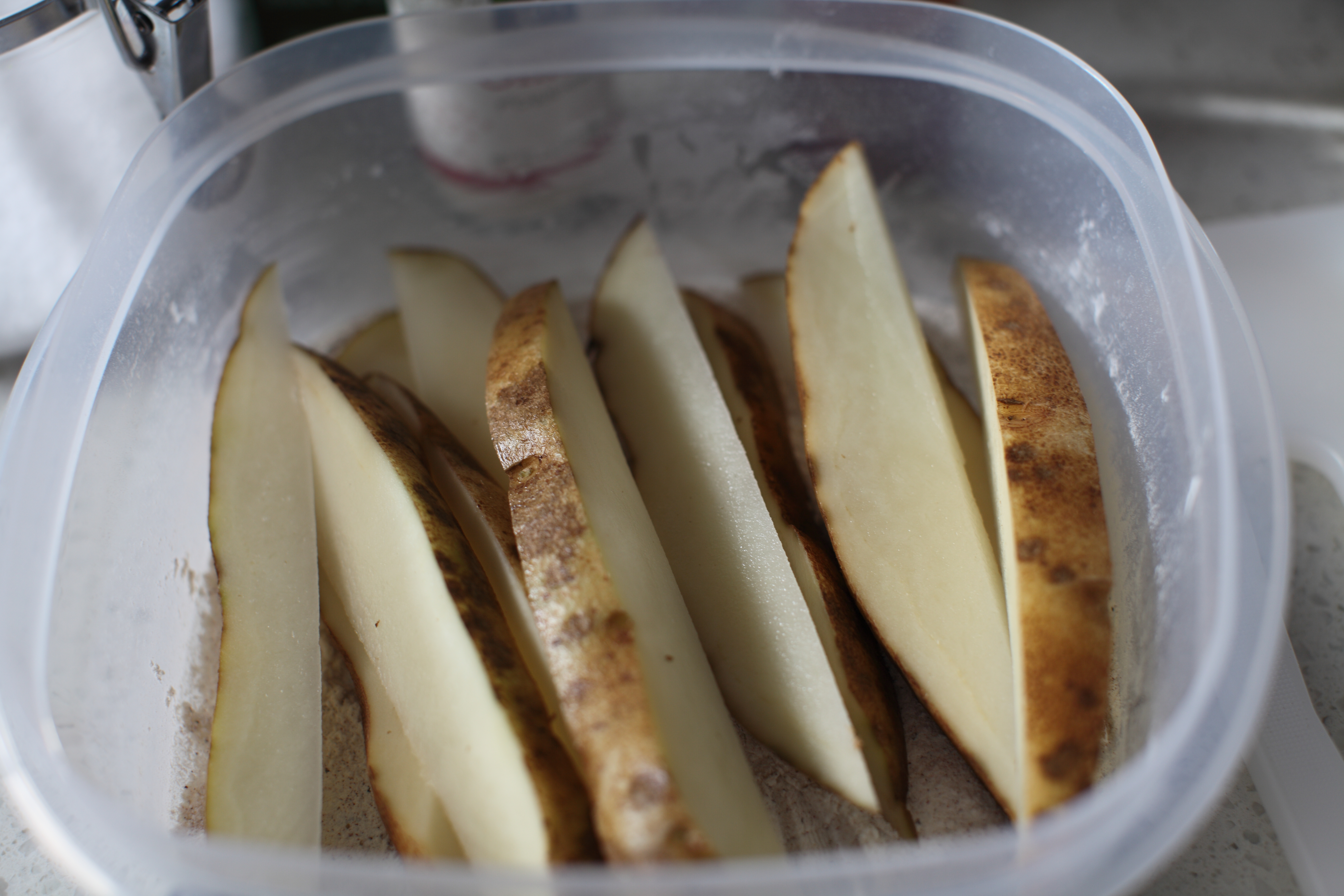 Cut potatoes into wedges. Place potatoes in flour mixture, seal container, and shake coating all over the potatoes.