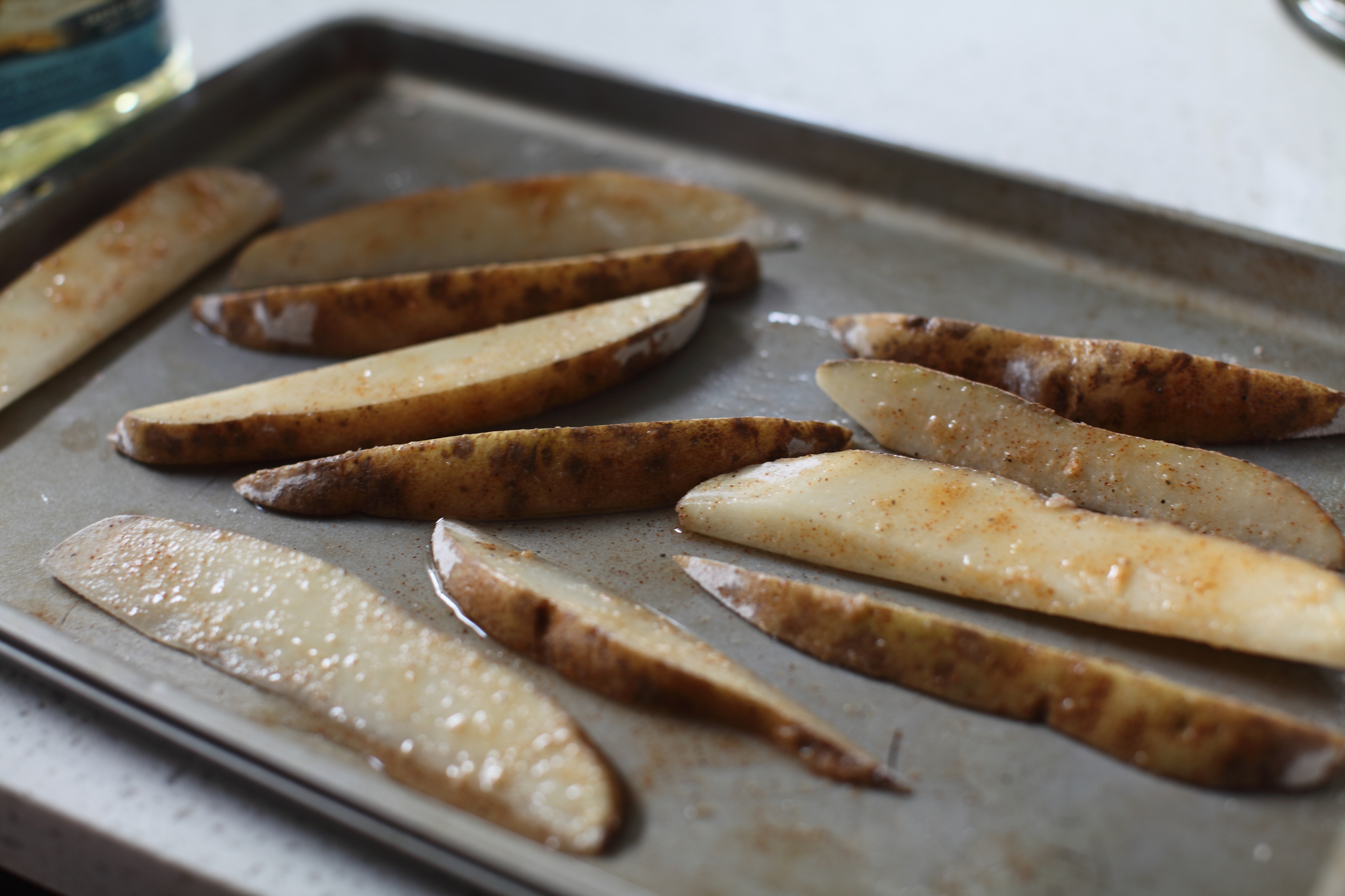 Lay potatoes in a single layering on a baking sheet. Drizzle oil over potatoes and toss coating potatoes evenly with oil. Lay potatoes back out in a single layer.