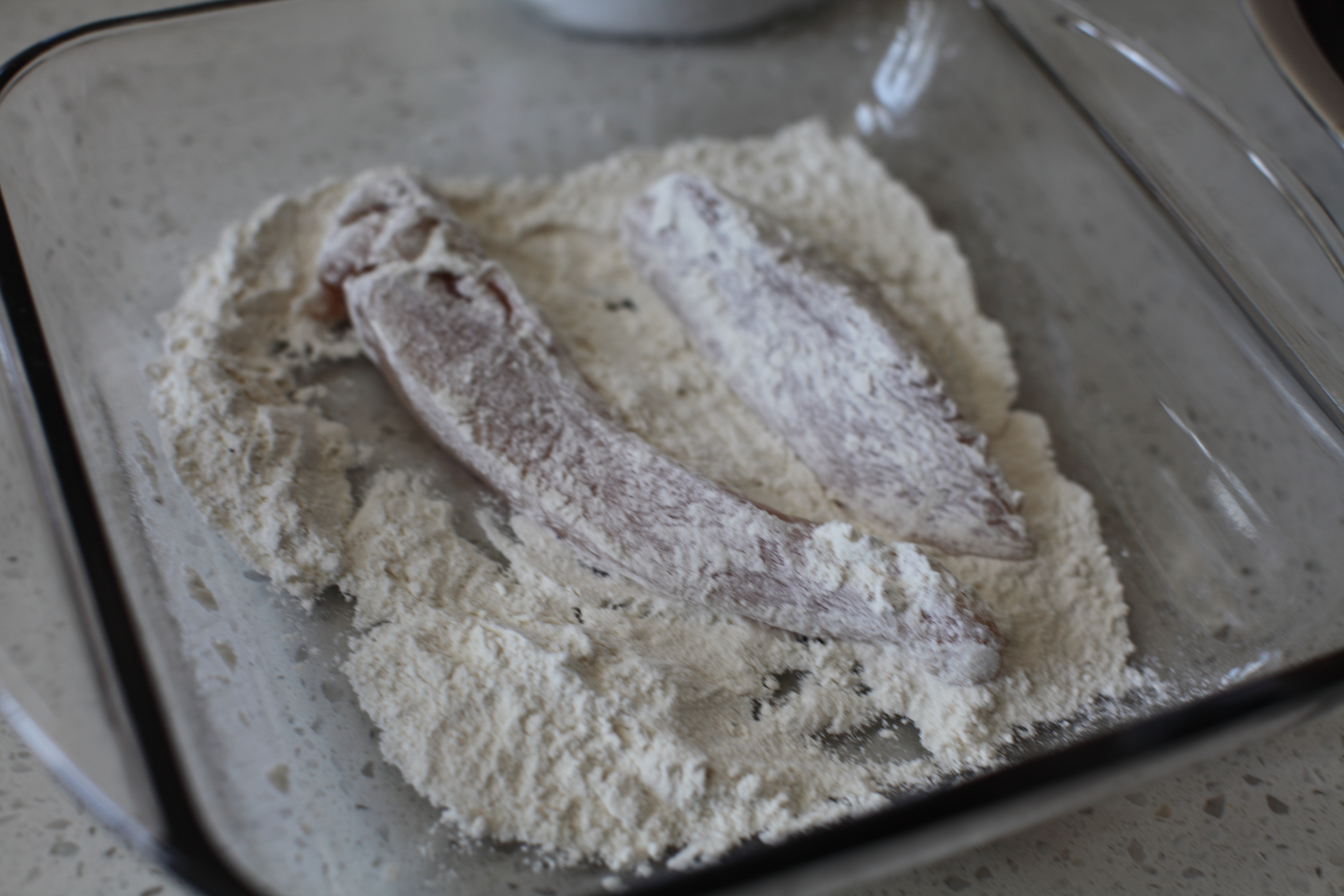 Starting with the flour, roll the chicken in the flour shaking off the excess and next into the egg allowing the excess to drip off. Lastly bread chicken in the cornflake mixture pressing the batter into the chicken. This is going to get messy but that’s ok that’s what hand soap is for!