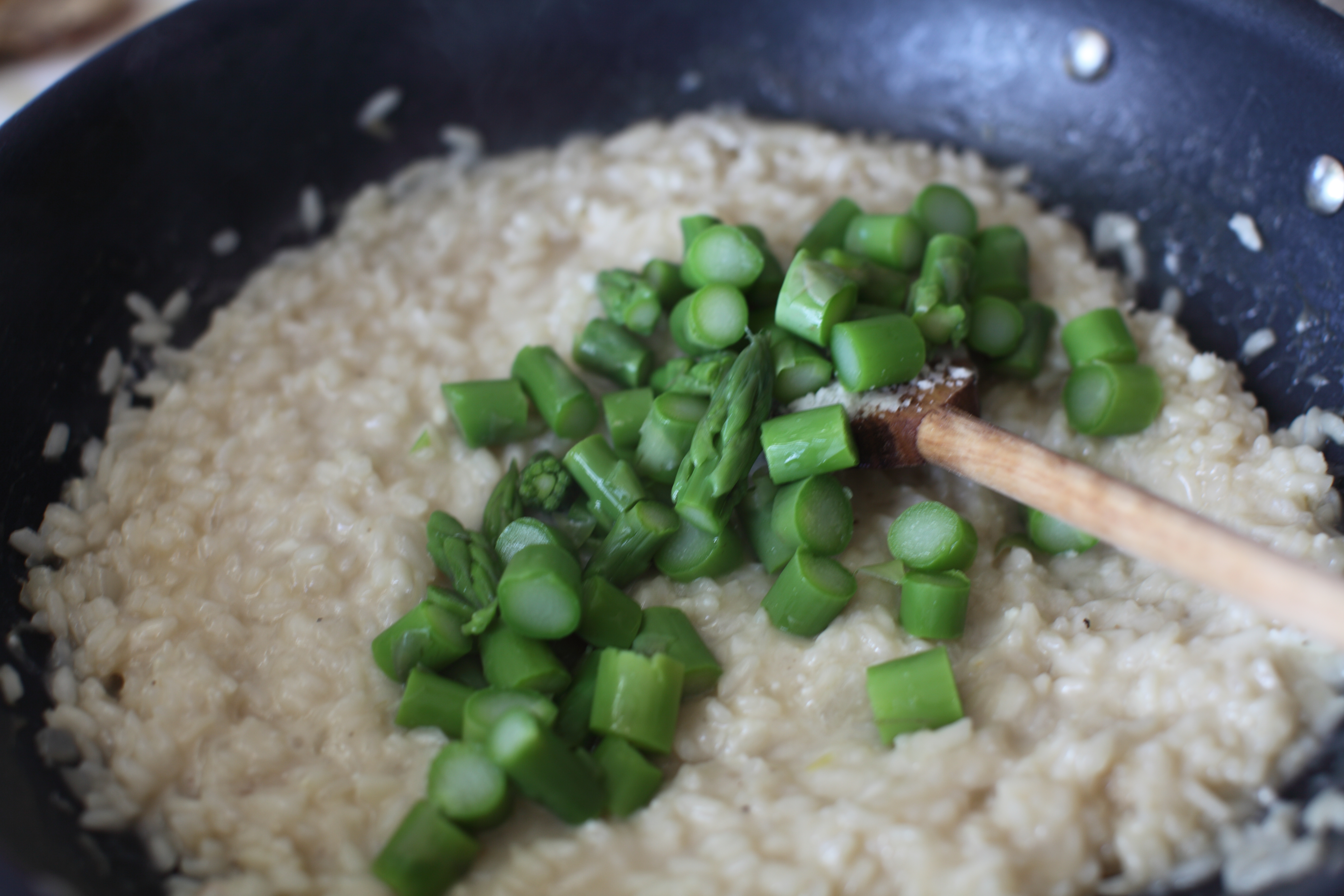 You might not need all the stock and sometimes you might need more, if that’s the case then rapidly heat hot water and ladle into risotto. When the rice is cooked al dente (taste test rice and check doneness), about 18 minutes total, stir in the butter and cheese. Season with salt and pepper. Stir in asparagus and warm through.