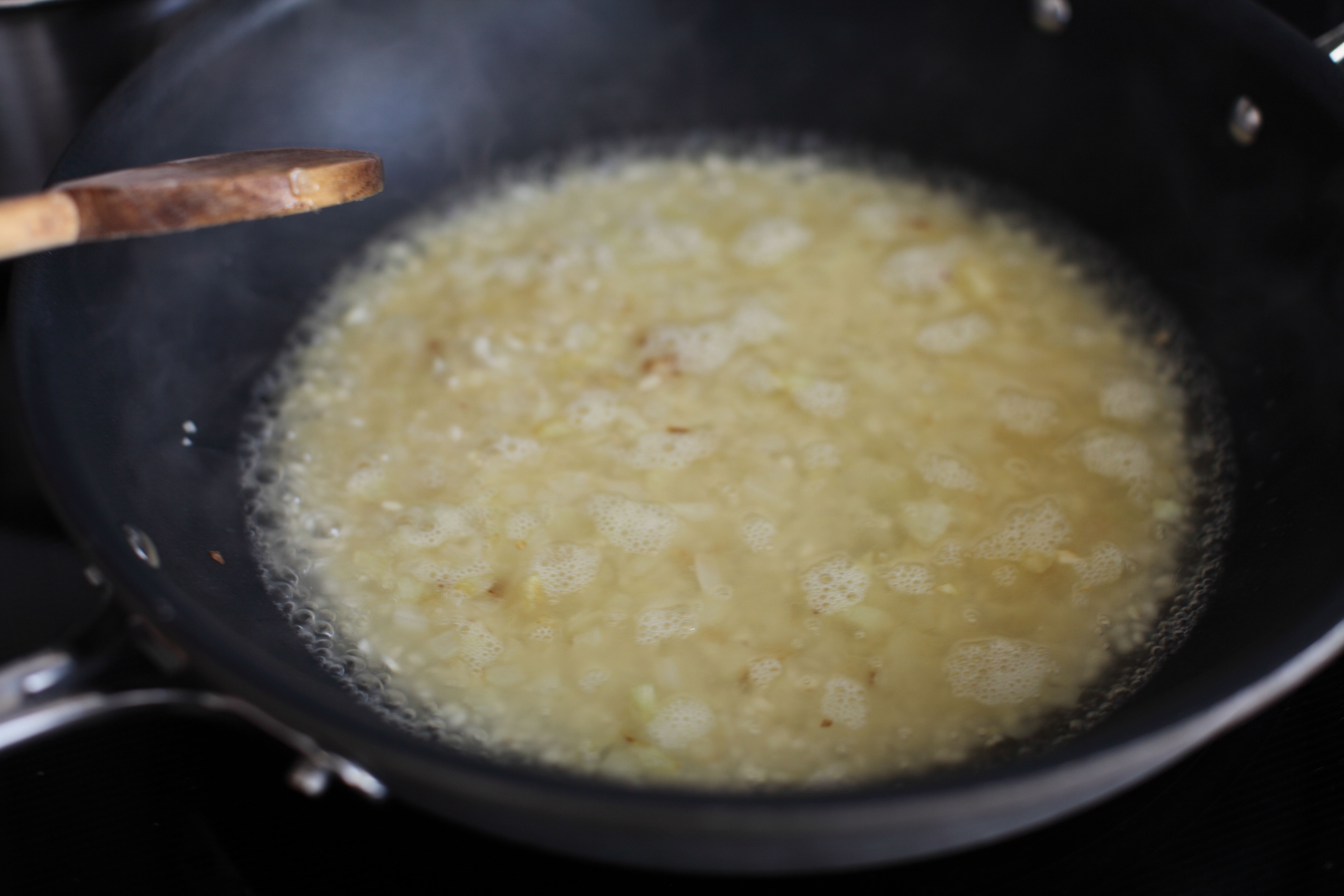 Add the hot stock a couple ladles at a time and stir with each addition. You will want to constantly stir to develop the starch and creamy aspect of risotto. Keep adding stock each time the pan starts to become dry at the edges.
