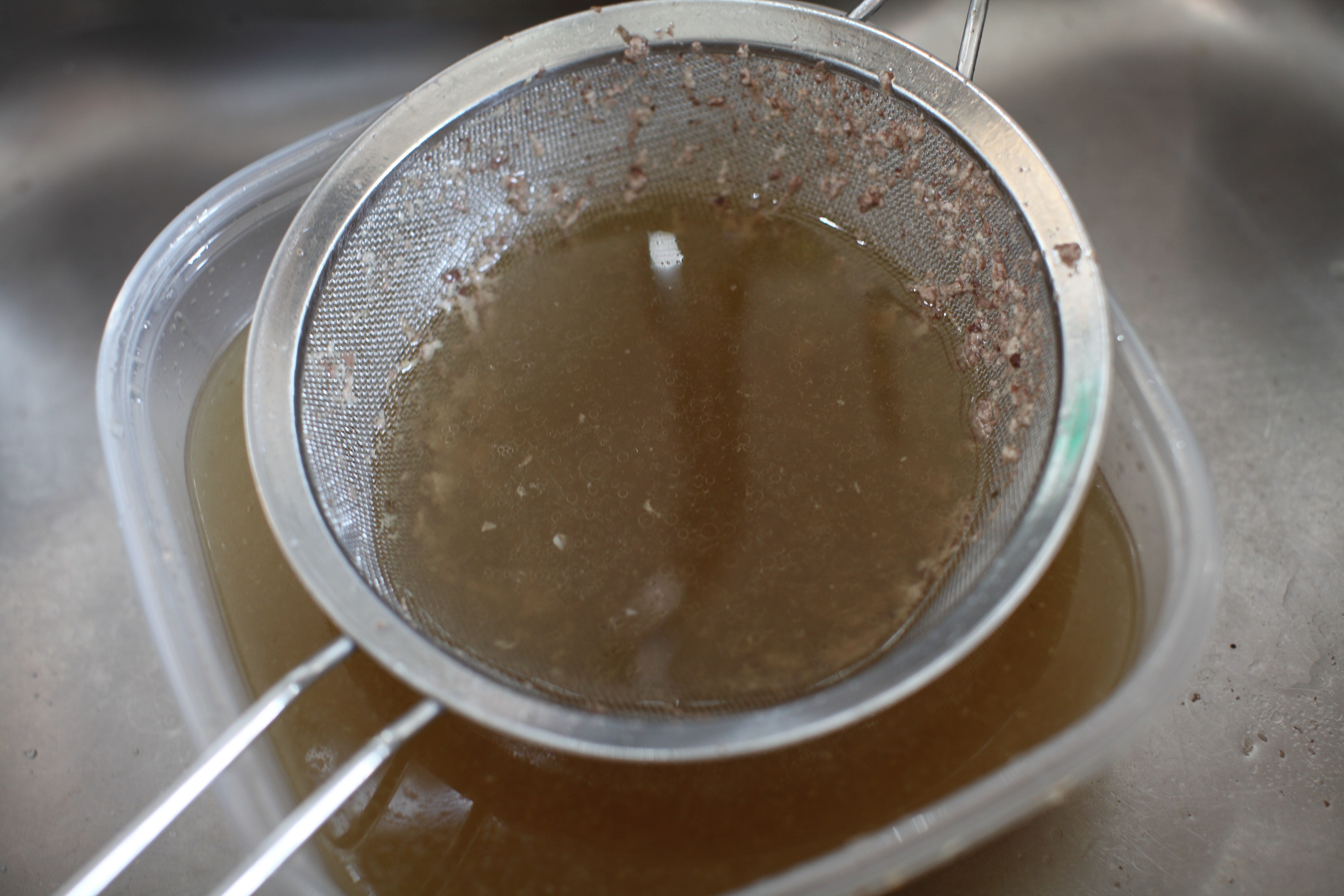 Once it’s done, discard all the large piece to your compost (or trash if you’re environmentally irresponsible…no judgement). Strain liquid through a fine mesh strainer to remove any solids from the stock. Sometimes I do it twice just so I have a nice clean stock. Store in a sealable container in the fridge overnight. The next morning skim any fats or solids from the top of the stock and you can store in the freezer for a month or if kept in the fridge, use it within the next 3 days. I save my old spaghetti sauce jars to reuse for stock so after I’m done straining it, I’ll funnel the stock into these jars. If I am freezing them, I’ll leave enough room for the liquid to expand while freezing. This time, I knew I was going to use the chicken stock later in the week for risotto and soup. This batch filled three 24 ounce jars.