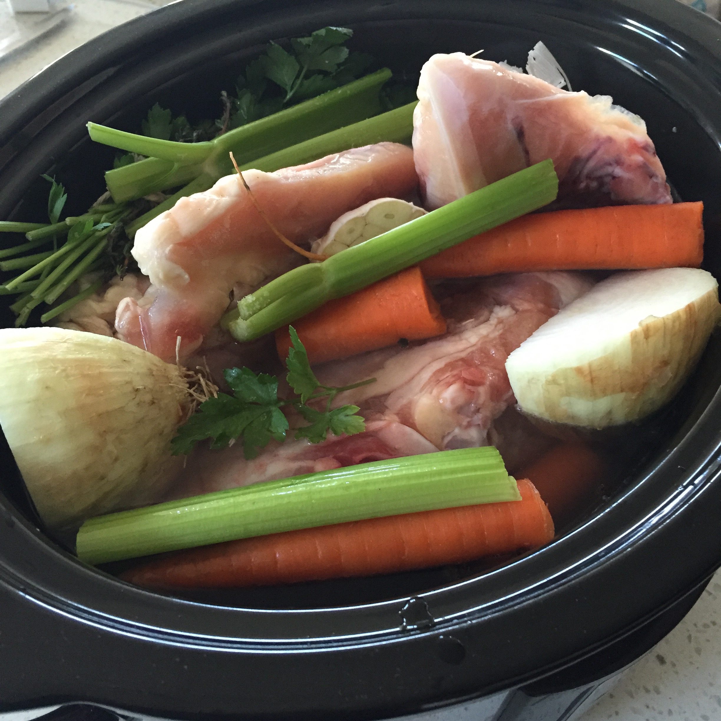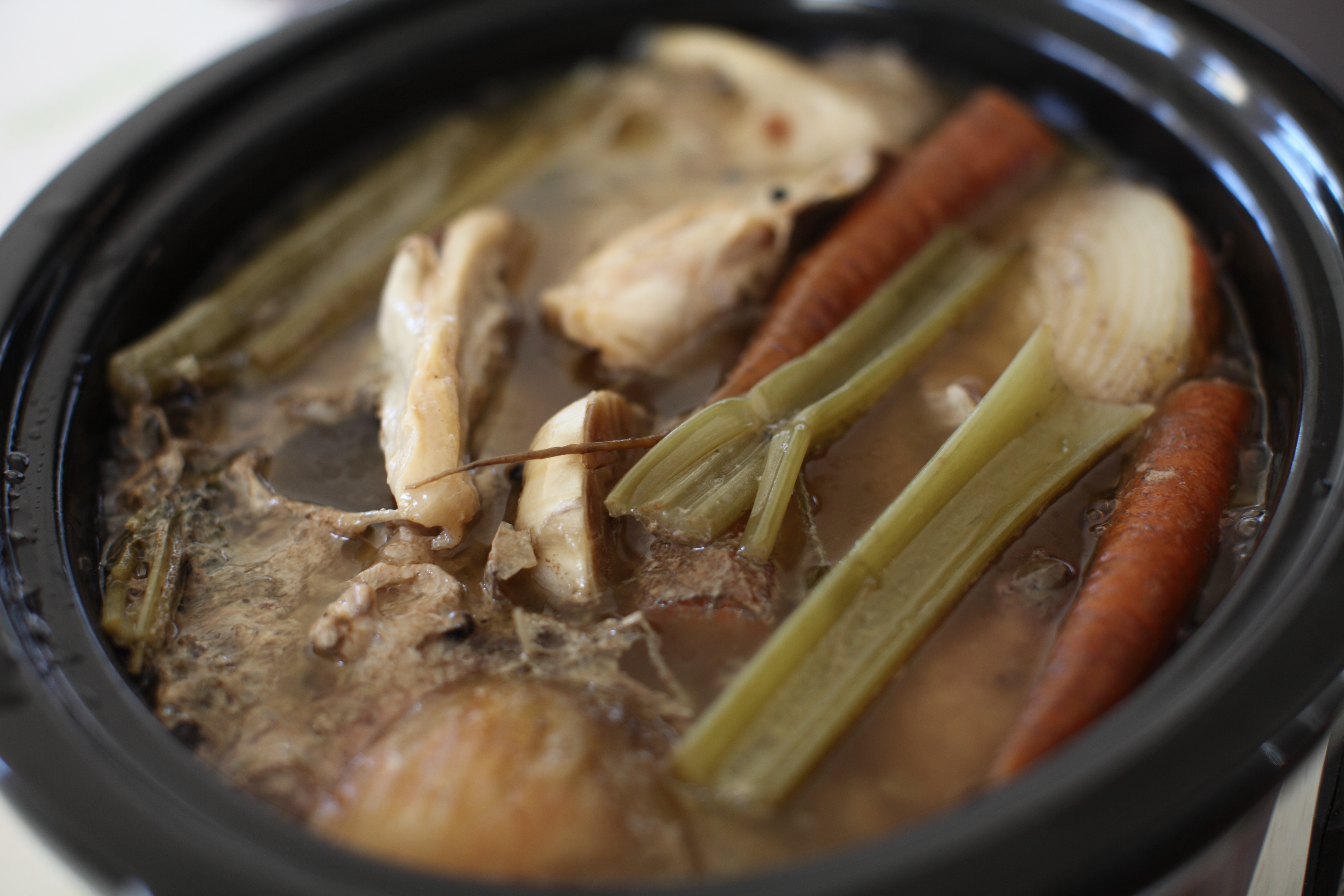 I like to either make this stock first thing in the morning so it’s done by the time my day is over, because ain’t nobody got time to sit and watch a stockpot full of chicken. Or, I like to do this before I go to bed and in the morning the house is filled with the aroma of that delicious chicken stock. 🎶The best part of waking up is chicken stock in your crock pot🎶 Sometimes I forget I am making chicken stock and I’ll walk through the door and smell the goodness and think “Did Scott surprise me and make me dinner?” Then I am absolutely surprised when I realize that it is just my crock pot and now I’m hungry.