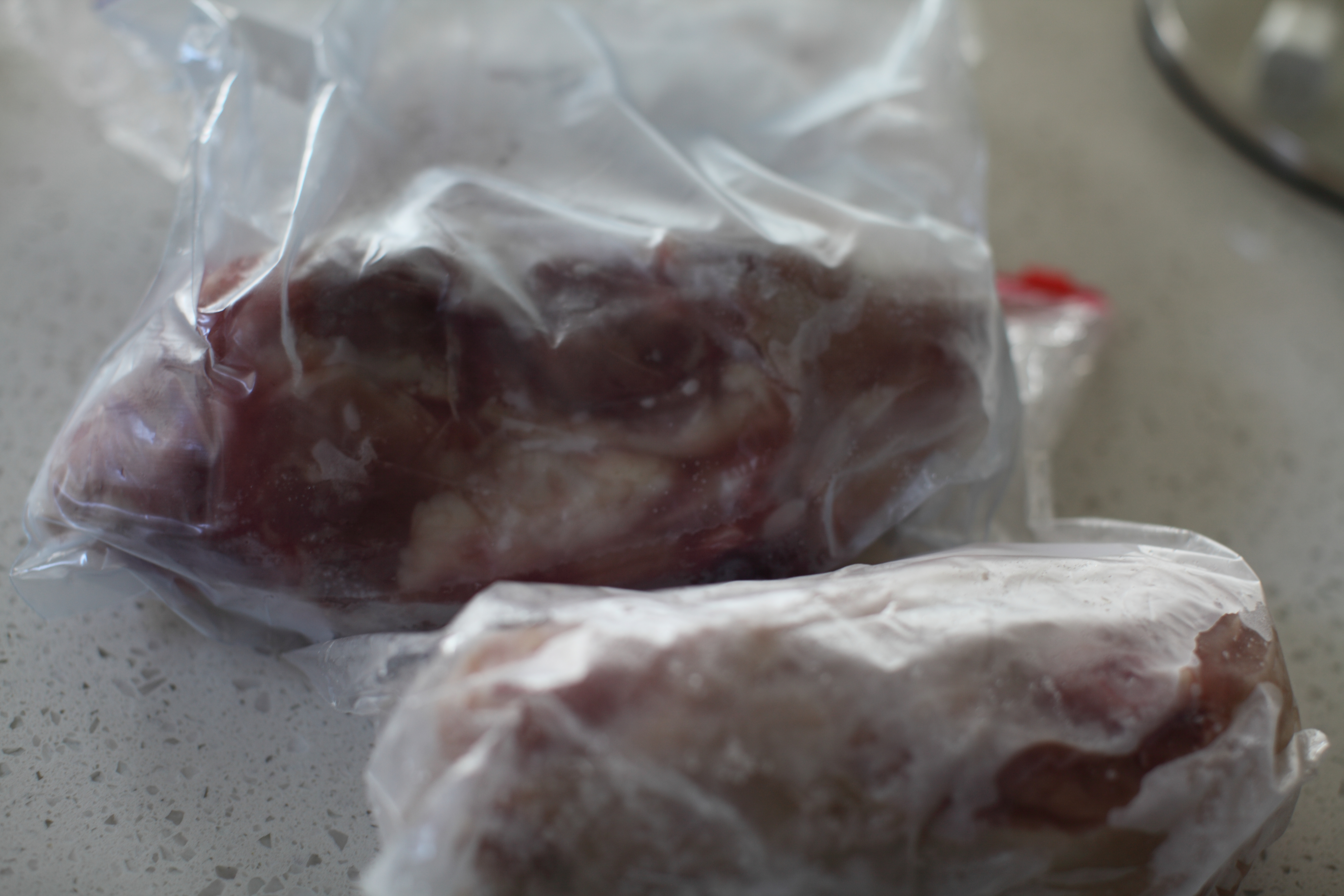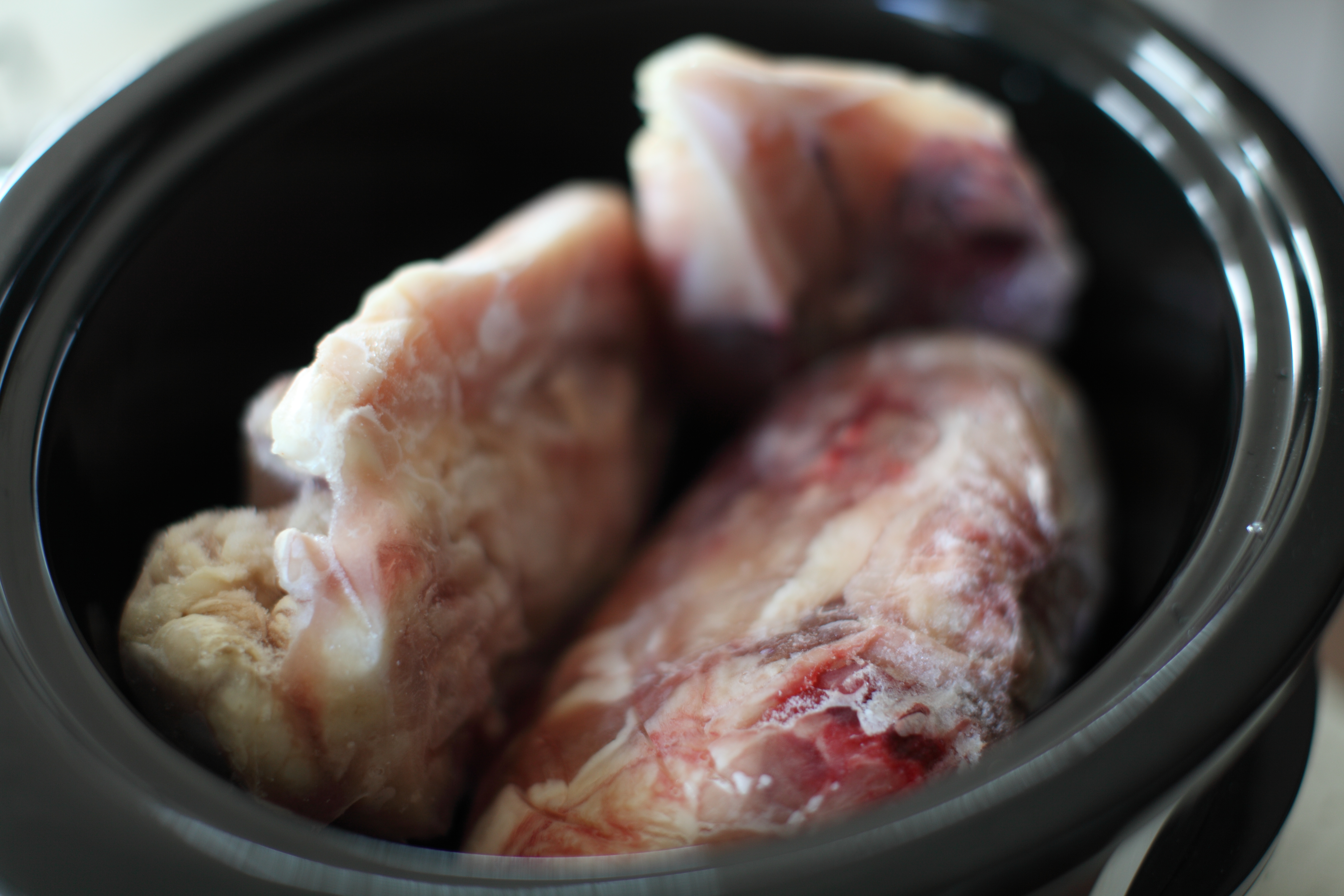 At least 3 pounds of chicken; you can use a whole chicken from the store or the pieces you’ve been keeping in the freezer (today I used a mix of a couple chicken carcasses and some boneless chicken thighs I had in the freezer along with one bone in chicken breast I had in the freezer as well)