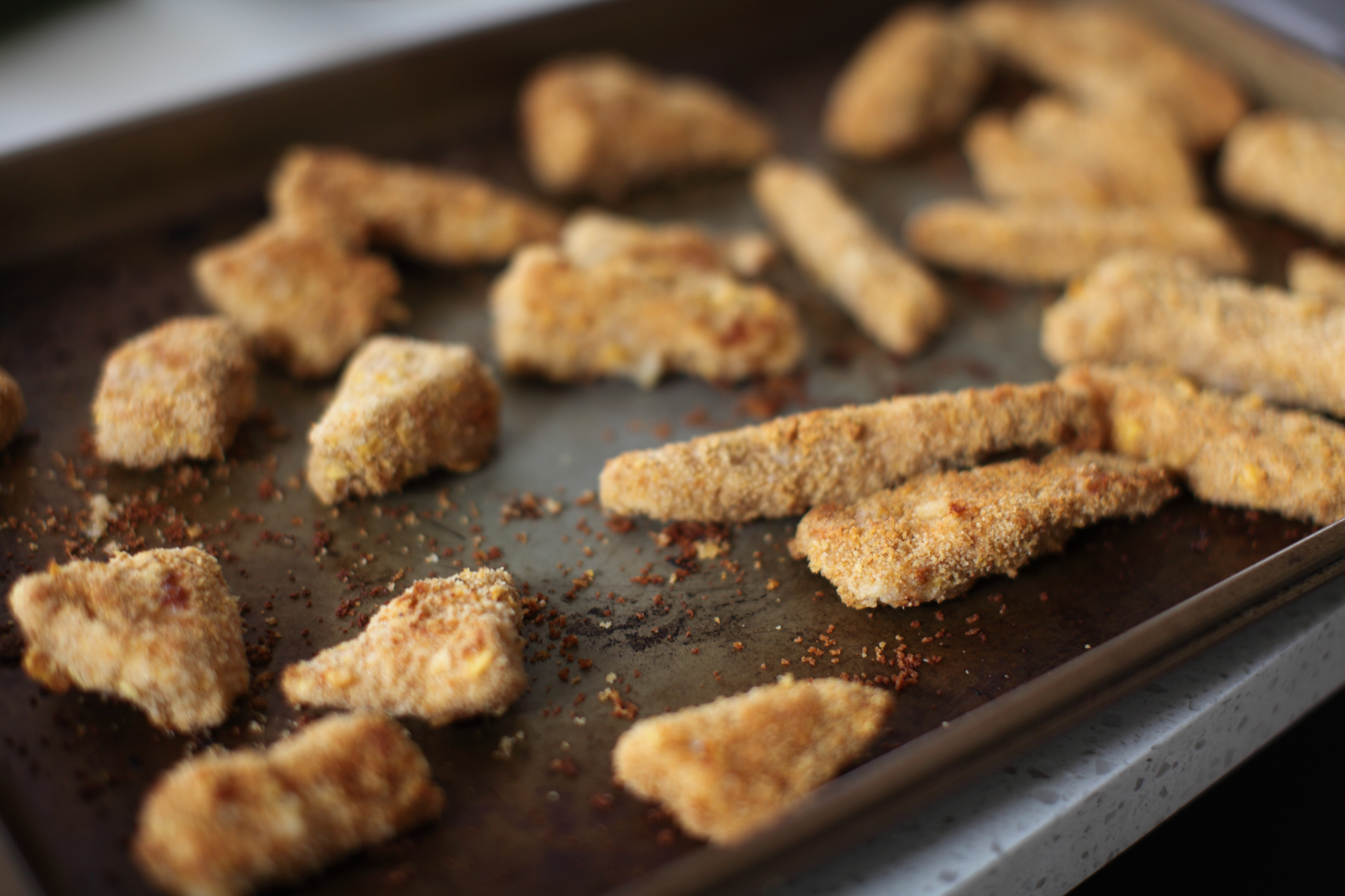 Place all nuggets and tenders onto a rimmed baking sheet and bake in oven, turning a few times during the baking process. Bake for 20-25 minutes until golden brown.