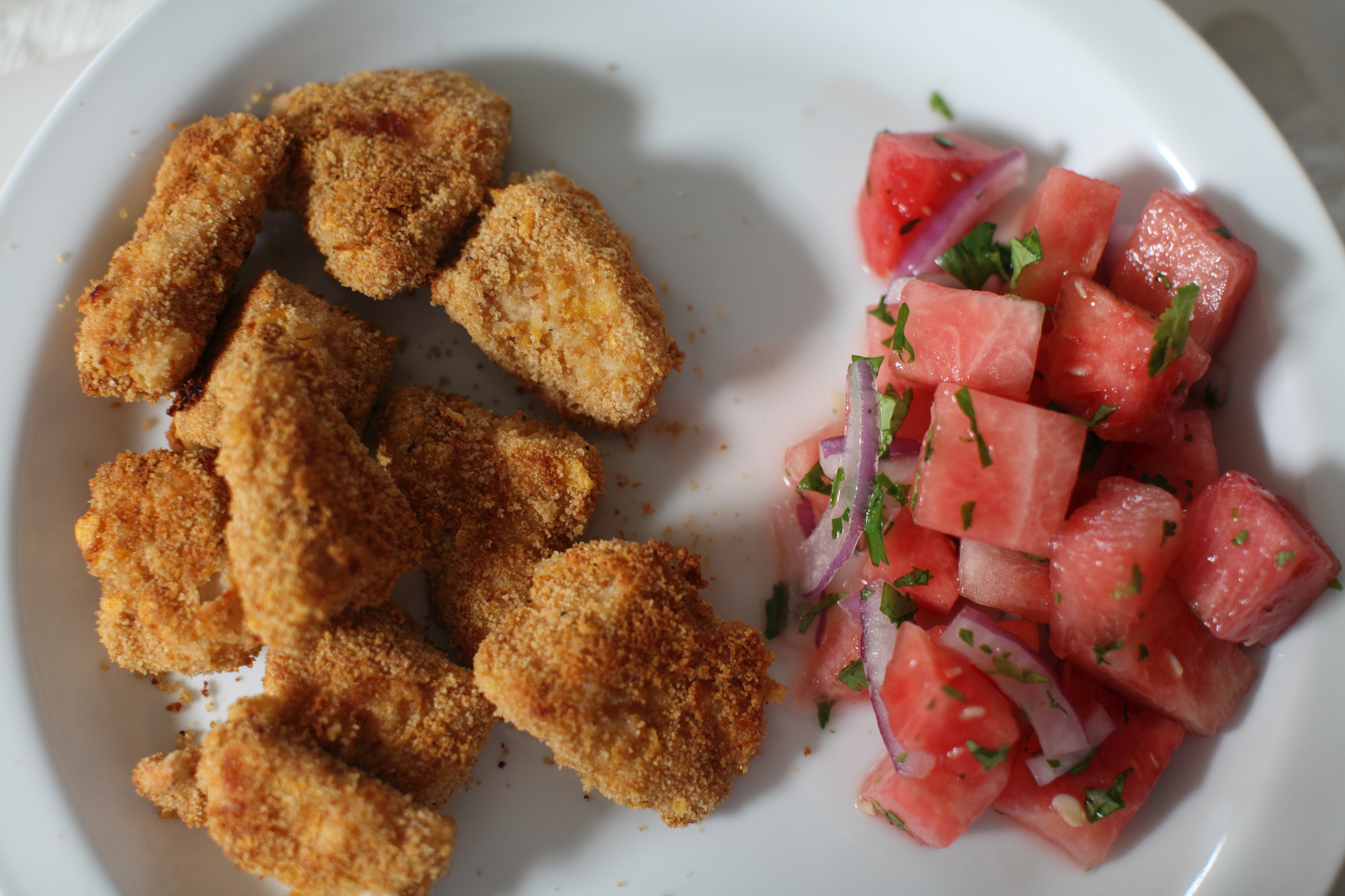 Once chicken nuggets and tenders are golden brown and the internal temperature is 165 degrees F, remove from oven. Be sure to lightly season the chicken when you immediately take them out of the oven with salt and pepper. Serve the nuggets along side the watermelon salad for the little ones.