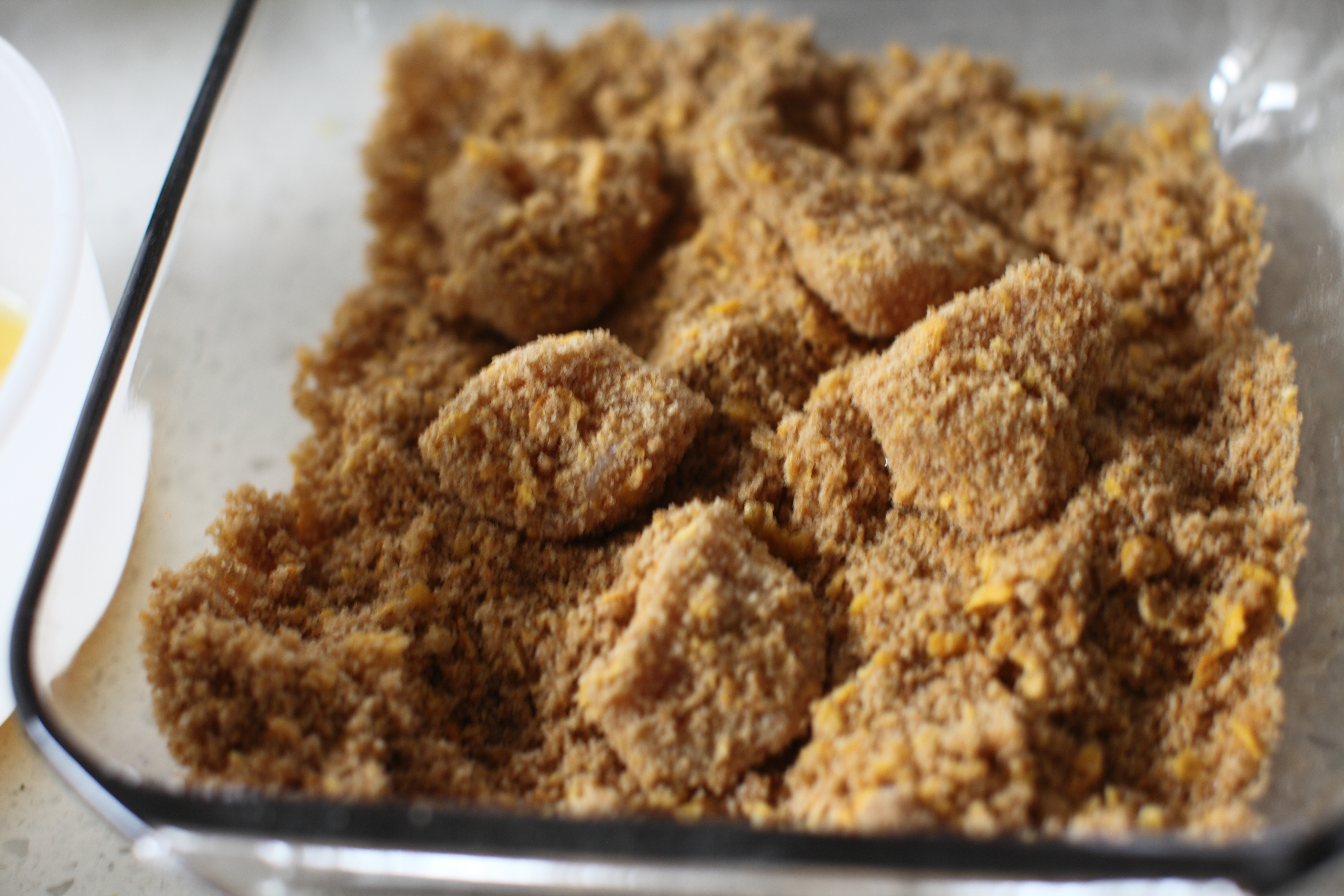 Get your dredging station ready. Start with flour seasoned with salt and pepper in one bowl, next egg wash, and then the cornflake and breadcrumb mixture. The cornflake mixture is a perfect opportunity to get the kiddies involved and let them smash and crush the flakes into crumbs. Put those kids to work! Combine corn flake crumbs, breadcrumbs, salt & pepper then drizzle with vegetable oil and mix together. Use your hands and get messy with it, the kids will love it!