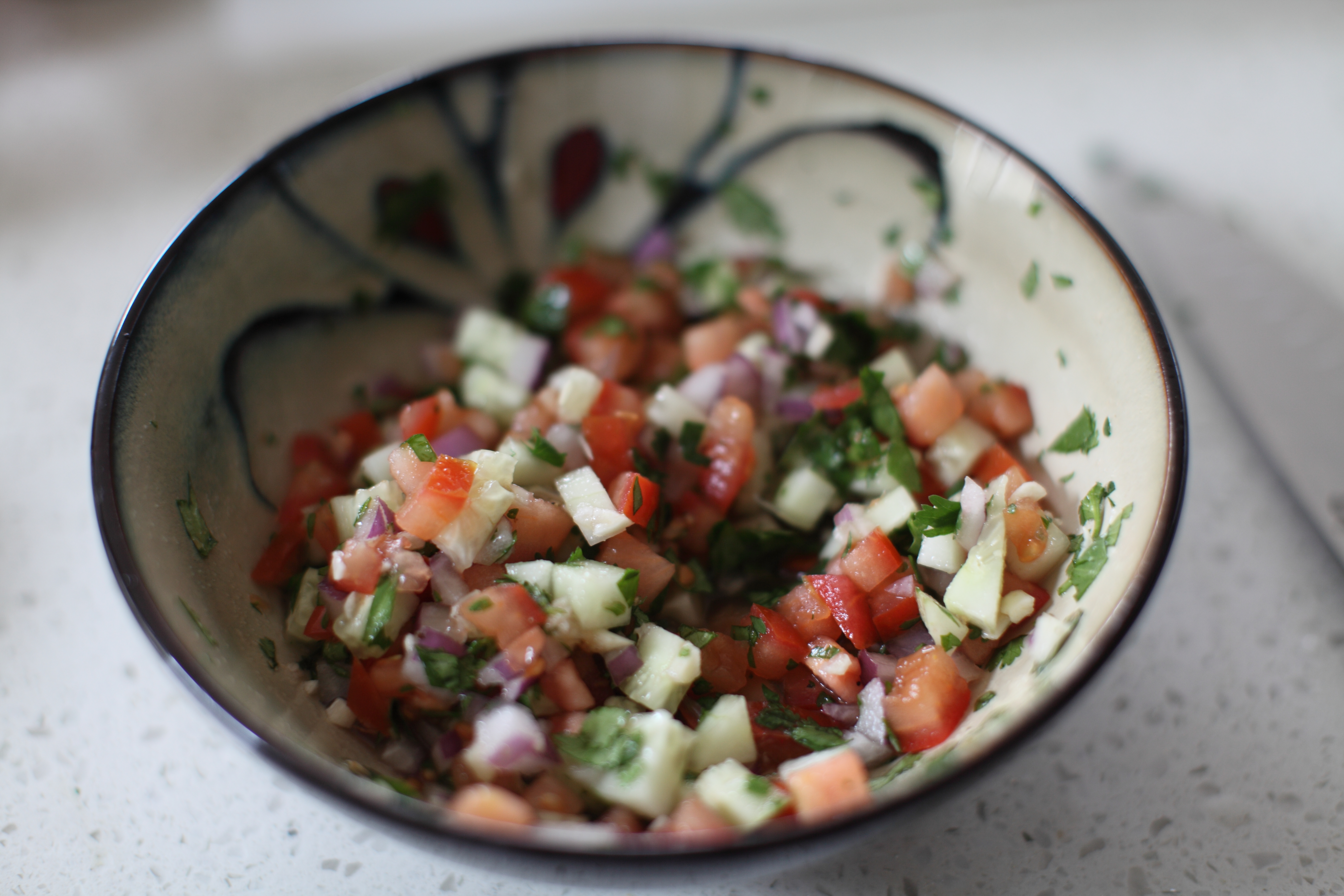While the tenders are baking, let’s get the cucumber pico de gallo ready. Mix together tomatoes, lime juice, cilantro, minced garlic, diced onion, jalapeño (optional), diced cucumber and season with salt and pepper. Set in refrigerator to marry all the flavors together and let it chill while the chicken is baking.