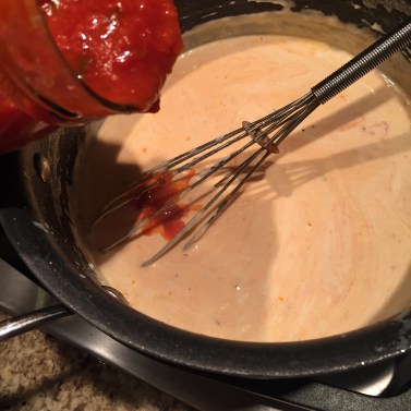 Slowly add the heavy cream and milk whisking everything together. Reduce heat to low and simmer until thickened. I test it on the back of a spoon. I dip the spoon in and check to see if the sauce immediately runs off. If it does, let it keep going until it has thickened. If you’re good to go, then stir in the cheese until it is melted. Once melted, add marinara sauce and let simmer until your pasta is ready to go.