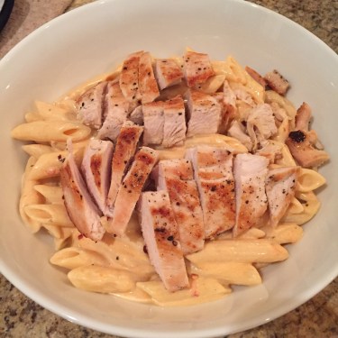 Drain your pasta and immediately toss with sauce. Add a couple pinches of crushed red pepper flakes and stir together. You can served this with grilled chicken breast if you’d like or you can opt out of it and keep it vegetarian.